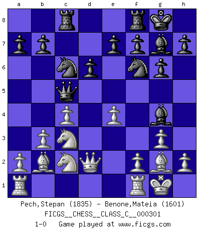 Last move : 1-0 2022 November 14 18:53:54 [Event "FICGS__CHESS__CLASS_C__000301"] [Site "FICGS"] [Date "2022.06.02"] [Round "1"] [White "Pech,Stepan"] [Black "Benone,Mateia"] [Result "1-0"] [WhiteElo "1835"] [BlackElo "1601"] 1.c4 c5 2.Nc3 Nf6 3.Nf3 Nc6 4.g3 g6 5.Bg2 Bg7 6.O-O O-O 7.d4 cxd4 8.Nxd4 Qb6 9.Nc2 d6 10.b3 Qc5 11.e4 Bg4 12.Qd2 Rac8 13.Bb2 1-0 This chess game has been lost on time (started : 2022.06.02 19:15:26) English : Symmetrical variation Kingside Castling by player White (move 6) Kingside Castling by player Black (move 6) Player White won this chess game. Follow this game move after move (download)In blitz, the Knight is stronger than the Bishop. (Vlastimil Hort) Ich liebe den Moment, wenn ich das Ego meines Gegenüber breche. (Robert James Fischer) El juego de Fischer siempre fue nítido, racional y brillante. Uno de los mejores por siempre. (Dave Regis) Le moment que je préfère le plus dans une rencontre, c'est celui où je sens que la personnalité de l'adversaire se brise. (Robert Fischer) It's only after you lost everything, Tyler says, that you're free to do anything. (Chuck Palahniuk, Fight Club)