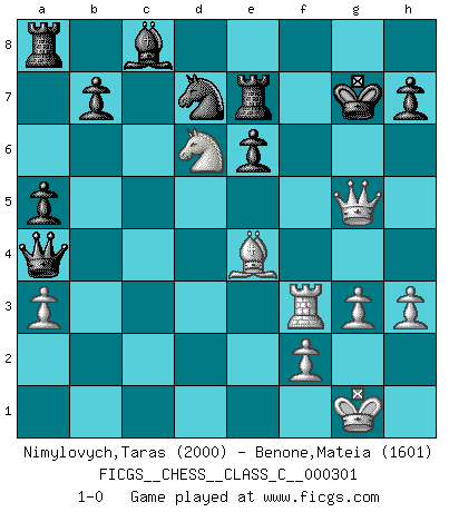 Last move : 1-0 2022 July 15 11:24:10 [Event "FICGS__CHESS__CLASS_C__000301"] [Site "FICGS"] [Date "2022.06.02"] [Round "1"] [White "Nimylovych,Taras"] [Black "Benone,Mateia"] [Result "1-0"] [WhiteElo "2000"] [BlackElo "1601"] 1.Nf3 c5 2.c4 e6 3.g3 g6 4.d4 d5 5.dxc5 Bxc5 6.Bg2 Nf6 7.O-O O-O 8.cxd5 Nxd5 9.Bh6 Re8 10.Qc1 Nd7 11.e4 N5f6 12.e5 Ng4 13.Nc3 f6 14.Ne4 Be7 15.Rd1 Qb6 16.a4 a5 17.h3 Ngxe5 18.Nxe5 Nxe5 19.Be3 Qb3 20.Ra3 Bxa3 21.bxa3 Nd7 22.Bh6 Re7 23.Rd6 Kf7 24.Rd2 g5 25.Nd6+ Kg6 26.Bxg5 fxg5 27.Be4+ Kf6 28.Rd3 Qxa4 29.Rf3+ Kg7 30.Qxg5+ 1-0 Reti Opening Kingside Castling by player White (move 7) Kingside Castling by player Black (move 7) Player White won this chess game. Follow this game move after move (download)A bad plan is better than none at all. (Frank Marshall) Im Hotelzimmer gab es nur zwei Schaben. (Über die Turnierbedingungen) (Peter Swidler) Una buena memoria, concentración, imaginación y una fuerte voluntad, se requiere para llegar a ser un buen jugador. (Bobby Fischer) Un journaliste : 'Vous préférez avoir une dame de plus sur l'échiquier ou au lit ?' Boris Spassky : 'Ca dépend de la position.' God is an atheist. (Unknown)