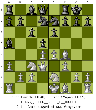 Last move : 0-1 2022 September 21 1:55:6 [Event "FICGS__CHESS__CLASS_C__000301"] [Site "FICGS"] [Date "2022.06.02"] [Round "1"] [White "Nudo,Davide"] [Black "Pech,Stepan"] [Result "0-1"] [WhiteElo "1840"] [BlackElo "1835"] 1.e4 c6 2.d4 d5 3.f3 e6 4.Nc3 Bb4 5.Nge2 Ne7 6.a3 Ba5 7.Bf4 O-O 8.Qd3 Nd7 0-1 Caro-Kann : Tartakower (fantasy) variation Kingside Castling by player Black (move 7) Player Black won this chess game. Follow this game move after move (download)One bad move nullifies forty good ones. (Horowitz) Nicht daß Diemer aus Opportunismus Mitglied der NSDAP geworden wäre. Er war ein Fanatiker, in allem, was er tat. (Hans Ree) El Ajedrez es en su esencia, un juego. En su forma, un arte. Y en su ejecución, una ciencia. (Baron Tassilo) Karpov est une pièce de musée. (Garry Kasparov) Bobby never cared about money, though. His only desire was to prove that his choices were correct: He wanted chess to be important because he was a chess player, and he wanted to be important. Bobby knew money was important, but he didn't have a clue why, outside of clothes and status. The only way he could accomplish what he wanted was to fight for a lot of money. Once he got it, he gave it away. He did not know how to spend it. And once he'd become champion, after, essentially, sacrificing his life for it, he didn't know how to spend his time. (Bob Wade)