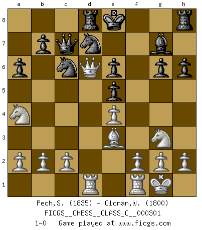 Last move : 1-0 2022 November 7 1:46:57 [Event "FICGS__CHESS__CLASS_C__000301"] [Site "FICGS"] [Date "2022.06.02"] [Round "1"] [White "Pech,Stepan"] [Black "Olonan,Wilfredo Olanka"] [Result "1-0"] [WhiteElo "1835"] [BlackElo "1800"] 1.e4 c5 2.Nf3 a6 3.d4 cxd4 4.Nxd4 h6 5.Nc3 e5 6.Nf5 d6 7.Bc4 Nf6 8.Be3 Qc7 9.Bb3 Be6 10.O-O g6 11.Ng3 Bg7 12.Qd2 Nc6 13.Rad1 Rd8 14.Na4 Nd7 15.Bxe6 fxe6 16.Qxd6 1-0 This chess game has been lost on time (started : 2022.06.02 19:15:26) Sicilian : O'Kelly variation Kingside Castling by player White (move 10) Player White won this chess game. Follow this game move after move (download)Nowadays, when you're not a grandmaster at 14, you can forget about it. (Anand Viswanathan) Ich erzeugte keinen Neid, da mich die Schachspieler als Musiker und die Musiker als Schachspieler betrachteten. (Mark Taimanov) Yo siempre he tenido un ligero sentimiento de lástima por una persona que no tiene conocimiento del Ajedrez. (Siegbert Tarrasch) Lorsque vous vous retrouvez devant une position atroce, ne tendez pas un ultime piège dérisoire avec l'intention d'abandonner si l'adversaire le déjoue ! Faites-vous plutôt un devoir de résister comme si votre vie en dépendait. Jouez le coup qui vous déplairait au centuple si vous étiez dans la peau de votre tortionnaire ! Luck is when opportunity knocks and you answer. (Anonymous)