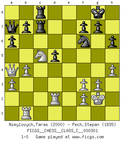 Last move : 1-0 2022 October 29 20:32:57 [Event "FICGS__CHESS__CLASS_C__000301"] [Site "FICGS"] [Date "2022.06.02"] [Round "1"] [White "Nimylovych,Taras"] [Black "Pech,Stepan"] [Result "1-0"] [WhiteElo "2000"] [BlackElo "1835"] 1.Nf3 Nf6 2.c4 c5 3.Nc3 Nc6 4.g3 d5 5.d4 e6 6.cxd5 exd5 7.Bg2 Be7 8.dxc5 Bxc5 9.O-O O-O 10.Na4 Be7 11.Be3 Re8 12.Nc3 h6 13.Rc1 Bb4 14.a3 Ba5 15.Qd3 Bg4 16.Rfd1 Bb6 17.Bxb6 Qxb6 18.Na4 Qa5 19.Nc5 Qb6 20.b4 Rac8 21.h3 Bxf3 22.Bxf3 Ne5 23.Qb3 Nxf3+ 24.exf3 Rc6 25.Kg2 Rec8 26.Qa4 R6c7 27.Rb1 a6 28.h4 Qa7 29.Rd2 1-0 This chess game has been lost on time (started : 2022.06.02 19:15:26) Reti Opening Kingside Castling by player White (move 9) Kingside Castling by player Black (move 9) Player White won this chess game. Follow this game move after move (download)The Pawns are the soul of the game. (Francois Andre Danican Philidor) Sicherlich können nur Meister einen Stil haben. Daß ein nicht-Meister auch nur ein einziges Mal in seinem Leben eine Partie folgerecht durchführte, habe ich niemals bemerkt. (Emanuel Lasker) Ciertamente, de todas la drogas del mundo, el Ajedrez debe ser el mas placentero permamentemente. (Assiac) Je ne crois pas en la psychologie, je crois aux bons coups. (Robert Fischer) The intuitive mind is a sacred gift; the rational mind is a faithful servant. We have created a society that honors the servant but has forgotten the gift. (Albert Einstein)
