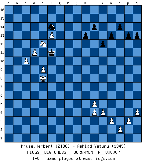 Last move : 1-0 2022 December 30 0:19:35 [Event "FICGS__BIG_CHESS__TOURNAMENT_A__000007"] [Site "FICGS"] [Date "2022.06.03"] [Round "1"] [White "Kruse,Herbert"] [Black "Aahlad,Yeturu"] [Result "1-0"] [WhiteElo "2186"] [BlackElo "1945"] 1.j2-k4 h15-g13 2.h1-o7 m15-m13 3.m2-m4 j15-k13 4.l1-p5 k16-h15 5.e2-e4 p16-o14 6.f1-b5 l16-p12 7.n2-n3 n15-n14 8.o1-f9 o16-j11 9.p5-j11 k13-j11 10.o7-l7 j11-l12 11.d2-d3 e15-e13 12.c1-k8 b16-c14 13.p1-n2 f16-c13 14.l7-c7 c13-h8 15.b1-c3 h16-o10 16.h3-h4 h15-j13 17.n2-o4 d15-d14 18.g1-h3 c16-h11 19.f9-h11 g13-h11 20.h3-g5 m13-m12 21.c7-h7 o10-k10 22.g5-j6 h8-c3 23.b2-c3 h11-f12 24.h7-g7 e16-e14 25.g7-k10 l12-k10 26.a1-b1 c14-d12 27.b5-d7 g15-g13 28.b1-b15 e14-e15 29.e1-b1 j16-h15 30.m1-m3 c15-c14 31.m3-l3 l15-l14 32.l3-l10 k10-h11 33.l10-b10 d12-b13 34.b15-e15 g16-e15 35.j6-h8 m16-m13 36.d7-g4 m13-k13 37.k8-j7 k13-k10 38.g4-p12 o14-p12 39.j1-j2 q16-m16 40.b10-k10 h11-k10 41.k1-l3 m16-m13 42.b1-b6 a16-m16 43.q1-b1 m13-o13 44.b6-p6 q15-q13 45.b1-b6 m16-m13 46.h8-f9 o13-o9 47.f9-d10 o9-a9 48.b6-a6 a9-d9 49.p6-d6 d9-d6 50.a6-d6 j13-l12 51.d6-a6 m13-j13 52.j7-a15 b13-a15 53.a6-a15 f12-g14 54.d10-c12 d14-d13 55.c12-e13 j13-j9 56.e13-g14 e15-g14 57.a15-f15 h15-j16 58.f15-a15 j9-b9 59.h2-f3 c14-c13 60.l3-j4 p12-n11 61.c3-c4 o15-o14 62.a15-a13 b9-c9 63.j4-g5 g14-f12 64.j2-h3 c13-c12 65.f3-d4 p15-p13 66.a2-a4 l12-j11 67.a4-a5 j11-g12 68.d4-b5 c9-c6 69.q2-q4 g12-e13 70.p2-p3 e13-d11 71.f2-f4 d11-c9 72.f4-f5 c9-b11 73.a13-a14 k10-j12 74.g5-e6 c6-c9 75.g2-g4 c9-a9 76.a14-a9 b11-a9 77.a5-a6 f12-d11 78.k4-h5 j12-h10 79.g4-g5 h10-f9 80.g5-g6 f9-d10 81.h5-f6 d11-c9 82.h3-g4 j16-h15 83.o4-m3 n11-m9 84.c4-c5 h15-g14 85.d3-d4 g14-f13 86.d4-d5 f13-e12 87.c2-c4 e12-d11 88.c5-c6 d11-c10 89.e6-d8 c10-d9 90.d8-b7 d10-c8 91.b5-c7 d9-d10 92.b7-a9 c8-a9 93.f6-e8 c9-e8 94.c7-e8 d10-d9 95.e8-c7 d9-c8 96.c7-b5 c8-b8 97.e4-e5 a9-c8 98.d5-d6 c8-b6 99.c4-c5 b6-a4 100.c6-c7 b8-a8 101.c5-c6 a4-c5 102.g4-g5 c5-a6 103.g5-f6 a6-b4 104.b5-d4 a8-a7 105.c7-c8 a7-b6 106.c6-c7 b6-b7 107.c8-c9 b7-c8 108.c9-c10 c8-c9 109.c10-c11 c9-c10 110.d4-e6 b4-d5 111.f6-g5 c10-c11 112.e6-f8 c11-d10 113.f8-g10 k15-k13 114.g10-j9 n14-n13 115.j9-k11 j14-j13 116.k11-l13 m9-l11 117.m3-l5 d5-e3 118.l2-l3 e3-f1 119.l5-j4 d10-e9 120.e5-e6 e9-f8 121.f5-f6 f8-g9 122.d6-d7 g9-h10 123.e6-e7 h10-j11 124.c7-c8 j11-k12 125.l13-k15 l11-j12 126.d7-d8 k12-l11 127.c8-c9 l11-l10 128.e7-e8 l10-l9 129.f6-f7 l9-l8 130.l3-l4 l8-k8 131.d8-d9 k8-j7 132.h4-h5 j7-j8 133.c9-c10 j8-j7 134.h5-h6 j7-j8 135.g6-g7 j8-h7 136.g5-h5 h7-j8 137.h5-j6 j8-j9 138.j6-h7 j9-h9 139.g7-g8 h9-g9 140.h7-g7 g9-g10 141.f7-f8 g10-h11 142.g8-g9 h11-j10 143.g7-g8 j10-j9 144.h6-h7 j9-k8 145.e8-e9 k8-j7 146.h7-h8 j7-j6 147.h8-h9 j6-j5 148.j4-l5 f1-h2 149.h9-h10 h2-j4 150.k2-k4 j5-h5 151.h10-h11 j12-k10 152.g9-g10 j4-l5 153.k4-l5 j13-j12 154.k15-h14 j12-h11 155.h14-f15 g13-g12 156.f15-h14 h11-g10 157.h14-g12 k10-h11 158.g12-e11 h11-f12 159.g8-g9 h5-j4 160.e11-g10 f12-e14 161.g10-e11 e14-c15 162.f8-f9 j4-j3 163.f9-f10 c12-c11 164.f10-f11 d13-d12 165.e11-g10 j3-h4 166.f11-f12 h4-g5 167.f12-f13 c15-d13 168.g10-h12 g5-f6 169.g9-f8 f6-e6 170.f8-e8 e6-f6 171.h12-f11 f6-g7 172.f11-d12 g7-g8 173.d12-e10 g8-h9 174.e10-c11 d13-f14 175.d9-d10 h9-g10 176.d10-d11 g10-f11 177.c11-e12 1-0 Follow this game move after move (download)Chess books should be used as we use glasses: to assist the sight, although some players make use of them as if they thought they conferred sight. (Jose Raul Capablanca) Im Schach nämlich geht es darum, daß Ich des Gegners klein zu kriegen, sein Ego zu zerbrechen und zu zermahlen, seine Selbstachtung zu zertreten und zu verscharren und seine ganze mißachtenswerte sogenannte Persönlichkeit ein für alle Mal tot zu hacken und zu zerstampfen und dadurch die menschliche Gesellschaft von einer stinkenden Pestbeule zu befreien. Es ist ein königliches Spiel. (Robert James Fischer) La enorme capacidad mental, en la que sin ella no puede un jugador de Ajedrez existir, es demasiado requerida por el Ajedrez al grado de que nunca podrá liberar su mente de este juego. (Albert Einstein) La vérité est comme le meilleur coup aux échecs : elle existe, mais il faut la chercher. (Arturo Perez-Reverte) If you lose the game you should win the analysis! (Proverb)