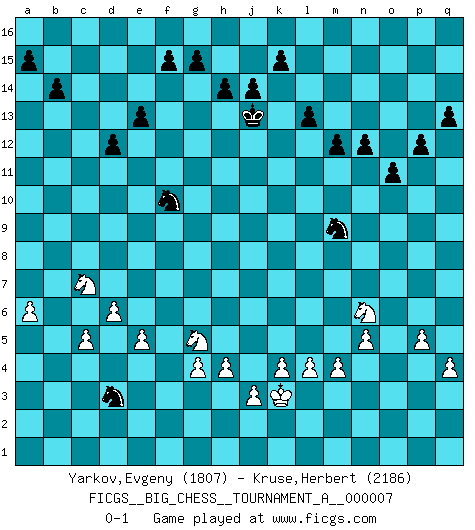 Last move : 0-1 2022 October 7 1:0:38 [Event "FICGS__BIG_CHESS__TOURNAMENT_A__000007"] [Site "FICGS"] [Date "2022.06.03"] [Round "1"] [White "Yarkov,Evgeny"] [Black "Kruse,Herbert"] [Result "0-1"] [WhiteElo "1807"] [BlackElo "2186"] 1.j2-k4 m15-m13 2.h1-o7 h15-g13 3.o7-c7 j15-k13 4.c7-c15 h16-o10 5.g2-g3 o10-o2 6.p1-o3 o2-f10 7.g1-f3 e15-e13 8.c15-c4 d15-d13 9.m2-m4 c16-j10 10.c4-d4 g16-f14 11.n2-n4 k16-h15 12.o1-j6 f16-a11 13.l1-p5 a11-f6 14.d4-d3 n15-n13 15.h3-h4 o16-f8 16.f1-l6 b16-c14 17.b1-c3 p16-n15 18.d3-f5 f6-h8 19.d2-d3 l16-o13 20.j6-h7 o13-h7 21.f5-h7 f8-g9 22.l2-l3 m16-m14 23.c1-l9 j10-g12 24.q2-q4 g12-e10 25.h7-p7 m14-p14 26.p7-n7 f10-b6 27.c3-e4 b6-b2 28.e1-c1 b2-g7 29.n7-g7 h8-g7 30.a1-b1 b15-b14 31.l6-j8 p14-p8 32.j8-m5 p8-a8 33.m5-h9 e10-f11 34.h9-f11 g13-f11 35.b1-b7 g7-f8 36.c1-a1 g9-j11 37.l9-j11 f8-j11 38.p5-j11 k13-j11 39.h2-j4 c14-d12 40.k1-h2 a16-c16 41.c2-c4 c16-c8 42.j1-j2 j16-j15 43.m1-b1 e16-c16 44.j4-g5 c8-p8 45.q1-p1 c16-c8 46.o3-p5 c8-b8 47.e4-c3 q16-c16 48.b7-b8 p8-b8 49.b1-b8 a8-b8 50.p1-b1 c16-c8 51.b1-b8 c8-b8 52.a1-b1 b8-b1 53.c3-b1 h15-j13 54.b1-c3 f14-g12 55.c3-b5 j13-k11 56.h2-j4 j15-k14 57.a2-a4 j11-k9 58.j4-k6 f11-g9 59.g5-h7 d12-e10 60.f3-g5 m13-m12 61.h7-g9 e10-g9 62.k6-h7 g9-h7 63.g5-h7 n15-m13 64.k4-l6 m13-l11 65.f2-f4 l11-m9 66.e2-e4 k11-h10 67.e4-e5 g12-f10 68.d3-d4 h10-g8 69.d4-d5 k14-j13 70.d5-d6 k9-j7 71.l6-j7 g8-j7 72.b5-c7 d13-d12 73.c4-c5 o15-o14 74.n4-n5 l15-l13 75.p5-n6 o14-o13 76.p2-p4 n13-n12 77.a4-a5 o13-o12 78.a5-a6 p15-p13 79.k2-k4 o12-o11 80.j2-k3 p13-p12 81.p4-p5 q15-q13 82.l3-l4 j7-h5 83.g3-g4 h5-f4 84.h7-g5 f4-d3 0-1 Follow this game move after move (download)Chess is like war on a board. (Bobby Fischer) Ich verstehe Aljechins Kombinationen ganz gut; aber woher er diese Angriffschancen bekommt und wie er die Eröffnung behandelt das ist für mich ein Buch mit sieben Siegeln. (Rudolf Spielmann) Fischer era un maestro de claridad y un Rey del posicionamiento astuto. Sus oponentes podían ver hacia donde se dirigía pero eran impotentes para detenerlo. (Bruce Pandolfini) C'est une question de caractère, Beaucoup de gens perdent leur motivation très vite. D'autres, ils sont rares, peuvent la conserver très longtemps. J'aime les échecs, encore aujourd'hui je suis heureux d'analyser des parties. J'aime toujours gagner, je déteste encore perdre. Bien jouer est important pour mon intégrité intellectuelle et morale. Et puis les échecs vivent en ce moment une période historique grâce à Internet. Ils se développent dans les systèmes éducatifs à travers le monde. Ils sortent de leur ghetto, et c'est mon rôle de mener à bien cette révolution. (Gary Kasparov) It's unlucky to be superstitious. (Dave Enteles)