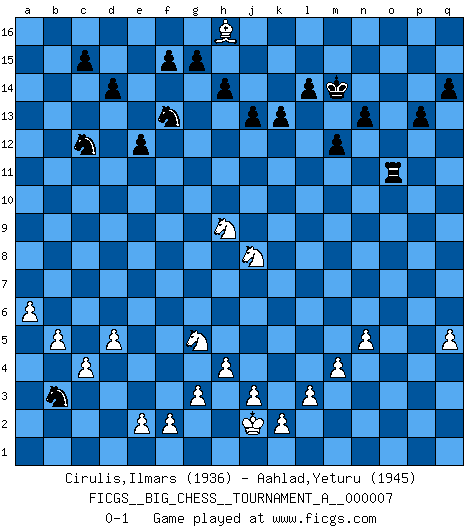 Last move : 0-1 2023 February 2 0:1:30 [Event "FICGS__BIG_CHESS__TOURNAMENT_A__000007"] [Site "FICGS"] [Date "2022.06.03"] [Round "1"] [White "Cirulis,Ilmars"] [Black "Aahlad,Yeturu"] [Result "0-1"] [WhiteElo "1936"] [BlackElo "1945"] 1.j2-k4 h15-g13 2.d2-d4 j15-k13 3.c1-j7 h16-o10 4.g2-g3 e15-e13 5.n2-n4 f16-b12 6.h1-a8 e13-e12 7.a8-j8 d15-d14 8.o1-b13 e16-e13 9.b13-g8 m15-m13 10.m2-m4 o10-o2 11.p2-p3 l16-o13 12.j8-n8 o2-o6 13.l1-o4 e13-a13 14.c2-c3 c16-k9 15.b1-d2 n15-n14 16.p1-n2 o16-k12 17.o4-j9 m13-m12 18.h3-h4 k9-h7 19.g8-h7 o13-h7 20.f1-k5 h7-k5 21.n8-k5 o6-j11 22.j9-k8 p16-n15 23.q1-o1 o15-o14 24.o1-o9 k12-l11 25.j7-g9 j11-k10 26.g9-n15 m16-m15 27.n15-h10 b12-h6 28.h10-j9 k10-k11 29.n2-l3 h6-d2 30.k8-d2 k11-k5 31.l3-k5 a13-a9 32.d2-k8 g13-h11 33.j9-l11 a9-o9 34.l11-g7 m15-m13 35.k8-o4 m13-n13 36.k1-l3 q16-m16 37.g1-h3 m16-m13 38.j1-j2 k13-l11 39.h2-j4 b16-d15 40.m1-o1 m13-b13 41.b2-b4 k16-l14 42.o4-k8 n13-o13 43.k8-h6 o9-o2 44.q2-q4 o2-o3 45.p3-p4 o3-o4 46.o1-o4 o13-o4 47.e1-p1 b13-c13 48.d4-d5 a16-e16 49.a1-o1 c13-o13 50.o1-o4 o13-o4 51.k5-j7 e16-e13 52.j7-g6 e13-o13 53.a2-a4 o4-o1 54.p1-o1 o13-o1 55.l3-m5 p15-p13 56.k4-j6 h11-g9 57.h6-j7 g9-e8 58.g7-h6 e8-f6 59.g6-e7 o1-a1 60.a4-a5 l11-k9 61.j7-a15 b15-b14 62.h6-g7 f6-e8 63.g7-j9 g16-e15 64.a15-b14 d15-b14 65.e7-f9 e15-f13 66.l2-l3 b14-c12 67.j6-h8 k9-h8 68.j9-h8 n14-n13 69.j4-h6 l14-k12 70.h6-j8 k12-j10 71.h8-k10 k15-k13 72.f9-h8 j10-h8 73.k10-h8 j16-k15 74.n4-n5 f13-e11 75.h8-k10 j14-j13 76.m5-k6 a1-p1 77.p4-p5 p1-q1 78.p5-p6 q1-p1 79.k10-p5 e8-c7 80.c3-c4 c7-a6 81.b4-b5 a6-c5 82.p5-j11 c5-b3 83.a5-a6 p1-p6 84.j11-n15 k15-l14 85.n15-o14 l14-m14 86.q4-q5 p6-p10 87.k6-l8 m14-n14 88.o14-m16 l15-l14 89.h3-g5 q15-q14 90.m16-k14 n14-m14 91.k14-h16 e11-f13 92.l8-k10 p10-p11 93.k10-h9 p11-o11 0-1 Follow this game move after move (download)A Chess game is divided into three stages: the first, when you hope you have the advantage, the second when you believe you have an advantage, and the third... when you know you're going to lose ! (Savielly Tartakower) Verschiedene, sehr schätzbare und im Laufe des Lebens nützliche Eigenschaften des Geistes können durch das Schachspiel erworben und gekräftigt werden, so dass sie zu Gewohnheiten werden, die uns nie im Stich lassen. (Benjamin Franklin) Cuando tu no sabes absolutamente que mas hacer, es tiempo de entrar en pánico. (John van der Wiel) Tous ces prétendus hommes politiques sont les pions, les Cavaliers, les Tours ou les Fous d'une partie d'échecs qui se jouera tant qu'un hasard ne renversera pas l'échiquier. (Honoré de Balzac) Never was anything great achieved without danger. (Niccolo Machiavelli)