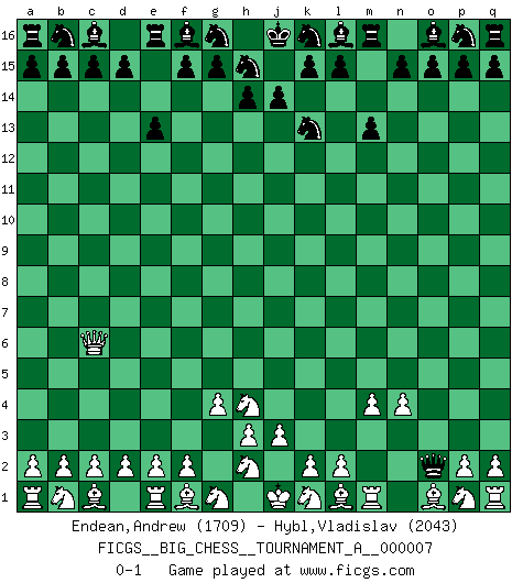 Last move : 0-1 2022 June 18 13:31:20 [Event "FICGS__BIG_CHESS__TOURNAMENT_A__000007"] [Site "FICGS"] [Date "2022.06.03"] [Round "1"] [White "Endean,Andrew"] [Black "Hybl,Vladislav"] [Result "0-1"] [WhiteElo "1709"] [BlackElo "2043"] 1.g2-g4 j15-k13 2.h1-c6 e15-e13 3.m2-m4 h16-o10 4.j2-h4 m15-m13 5.n2-n4 o10-o2 0-1 Follow this game move after move (download)Castle early and often. (Rob Sillars) Frage: Wie viele Autos haben Sie schon zerstört? - Antwort: Nur zwei. (Loek van Wely) Los problemas de Ajedrez exigen del compositor las mismas virtudes que caracterizan todo el arte de valor: originalidad, invención, concisión, armonía, complejidad e insinceridad explendida. (Vladimir Nabokov) Un journaliste : 'Vous préférez avoir une dame de plus sur l'échiquier ou au lit ?' Boris Spassky : 'Ca dépend de la position.' All the troubles of the world come from being unable to sit alone in a quiet room. (Blaise Pascal)