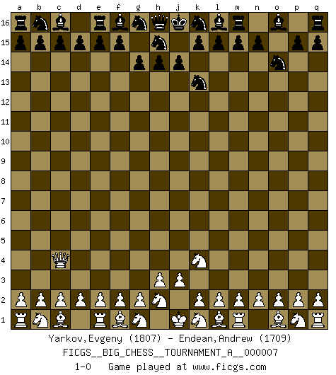 Last move : 1-0 2022 June 15 21:21:49 [Event "FICGS__BIG_CHESS__TOURNAMENT_A__000007"] [Site "FICGS"] [Date "2022.06.03"] [Round "1"] [White "Yarkov,Evgeny"] [Black "Endean,Andrew"] [Result "1-0"] [WhiteElo "1807"] [BlackElo "1709"] 1.j2-k4 j15-k13 2.h1-o7 g15-g14 3.o7-o15 p16-o14 4.o15-c4 1-0 Follow this game move after move (download)With or without the title, Bobby Fischer was unquestionably the greatest player of his time. (Burt Hochberg) Ich kenne Menschen, die allen Willen der Welt besitzen und doch nicht Schach spielen können. (Robert James Fischer) Fischer no está bajo la obligación de nadie. (Joseph Platz) Toutes les manuvres exécutées sur une colonne ouverte ont pour but ultime l'intrusion définitive sur la septième ou la huitième rangée, en plein cur de la position ennemie. (Aaron Nimzovitch) Games, world of games... There's always an opponent, and there's always a victim. (Revolver, movie)