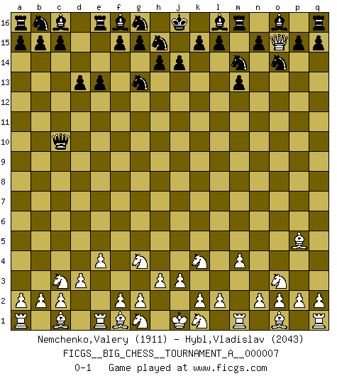 Last move : 0-1 2022 August 10 21:38:32 [Event "FICGS__BIG_CHESS__TOURNAMENT_A__000007"] [Site "FICGS"] [Date "2022.06.03"] [Round "1"] [White "Nemchenko,Valery"] [Black "Hybl,Vladislav"] [Result "0-1"] [WhiteElo "1911"] [BlackElo "2043"] 1.m2-m4 j15-k13 2.p1-o3 h16-o10 3.h2-g4 o10-c10 4.j2-k4 m15-m13 5.b1-c3 e15-e13 6.e2-e4 h15-g13 7.h1-o7 d15-d13 8.l1-p5 k16-h15 9.o7-o15 p16-o14 10.d2-d3 k13-m14 0-1 This big chess game has been lost on time (started : 2022.06.03 6:10:8) Follow this game move after move (download)When you play Bobby, it is not a question if you win or lose. It is a question if you survive. (Boris Spassky) Es gibt zwei Arten von Opfern: Korrekte und meine. (Mikhail Nekhemyevich Tal) El Ajedrez es parte de la cultura, y si una cultura esta en decadencia, entonces también el Ajedrez declinará. (Mikhail Botvinnik) Il (Jacob Murray) ne joue pas pour le bon coup, mais pour le meilleur. (Eloi Relange) First of all, we have to go back to the classical time control. (Anatoly Karpov)