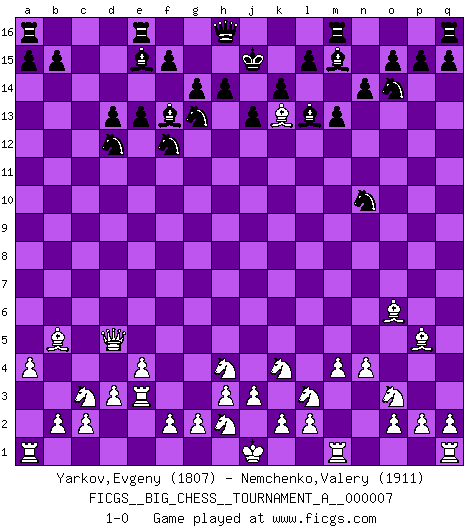 Last move : 1-0 2022 August 18 23:39:32 [Event "FICGS__BIG_CHESS__TOURNAMENT_A__000007"] [Site "FICGS"] [Date "2022.06.03"] [Round "1"] [White "Yarkov,Evgeny"] [Black "Nemchenko,Valery"] [Result "1-0"] [WhiteElo "1807"] [BlackElo "1911"] 1.j2-k4 h15-g13 2.h1-o7 p16-o14 3.o7-l7 k16-l14 4.l7-c15 b16-c14 5.c15-g11 j15-k13 6.p1-o3 n15-n14 7.m2-m4 e15-e13 8.l1-p5 f16-e15 9.e2-e4 g16-j15 10.f1-b5 k15-k14 11.d2-d3 m15-m13 12.c1-l9 j15-h13 13.g11-d11 g15-g14 14.n2-n4 h13-f12 15.d11-d5 d15-d13 16.o1-f9 l14-m12 17.b1-c3 l16-m15 18.g1-j2 o16-l13 19.k1-l3 c14-d12 20.j2-h4 c16-f13 21.e1-e3 m12-n10 22.l9-o6 j14-j13 23.a2-a4 j16-j15 24.f9-k13 1-0 This big chess game has been lost on time (started : 2022.06.03 6:10:8) Follow this game move after move (download)You have to have the fighting spirit. You have to force moves and take chances. (Bobby Fischer) Matt entspricht nicht immer den Tatsachen. (Savielly Grigorievitsch Tartakower) Si tu oponente no puede hacer nada activo, entonces no apures la posición; En vez de eso, dejalo estar sentado ahí, sufriendo y rogandote por un empate. (Jeremy Silman) Si rien de grave n'est détecté lors de l'analyse d'une position, on joue alors le coup. Seconde règle de Blumenfeld. A good aphorism is too hard for the tooth of time, and is not worn away with the centuries, although it serves as food for every speech. (Friedrich Nietzsche)