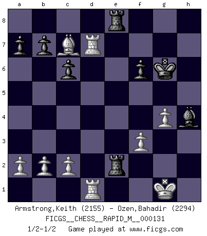 Last move : 1/2-1/2 2022 June 21 8:53:36 [Event "FICGS__CHESS__RAPID_M__000131"] [Site "FICGS"] [Date "2022.06.07"] [Round "1"] [White "Armstrong,Keith"] [Black "Ozen,Bahadir"] [Result "1/2-1/2"] [WhiteElo "2155"] [BlackElo "2294"] 1.e4 e5 2.Nf3 Nc6 3.Bb5 Nf6 4.O-O Nxe4 5.d4 Nd6 6.Bxc6 dxc6 7.dxe5 Nf5 8.Qxd8+ Kxd8 9.h3 Be7 10.Nc3 Nh4 11.Nxh4 Bxh4 12.Rd1+ Ke8 13.g4 h5 14.f3 f6 15.exf6 gxf6 16.Bf4 Be6 17.Ne2 Kf7 18.Nd4 Rae8 19.Bxc7 hxg4 20.Nxe6 Rxe6 21.Rd7+ Kg6 22.hxg4 Re2 23.Rad1 Rhe8 1/2-1/2 Ruy Lopez : Berlin defense, Open variation Kingside Castling by player White (move 4) This chess game ended in a draw. Follow this game move after move (download)Chess is everything: art, science and sport. (Anatoly Karpov) Darum geht es im Schach. Einen Tag gibst du deinem Gegner eine Lektion, am nächsten Tag gibt er dir eine. (Robert James Fischer) Un Peón pasado es un criminal, quién debe ser mantenido bajo candado y llave. Leves medidas, tales como vigilancia policiaca, no son suficientes. (Aaron Nimzovich) La menace est plus forte que l'exécution. (Aaron Nimzovitch) Computers make it easier to do a lot of things, but most of the things they make it easier to do don't need to be done. (Andy Rooney)
