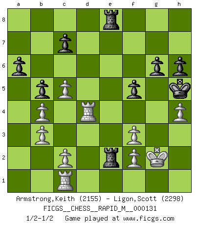 Last move : 1/2-1/2 2022 June 30 5:38:44 [Event "FICGS__CHESS__RAPID_M__000131"] [Site "FICGS"] [Date "2022.06.07"] [Round "1"] [White "Armstrong,Keith"] [Black "Ligon,Scott"] [Result "1/2-1/2"] [WhiteElo "2155"] [BlackElo "2298"] 1.e4 e5 2.Nf3 Nc6 3.Bb5 a6 4.Ba4 Nf6 5.O-O Be7 6.Re1 b5 7.Bb3 O-O 8.h3 Bb7 9.d3 d5 10.exd5 Nxd5 11.Nbd2 Nf4 12.Ne4 Na5 13.Bxf4 Nxb3 14.axb3 exf4 15.d4 f5 16.Nc5 Bxc5 17.dxc5 Qxd1 18.Rexd1 Bxf3 19.gxf3 Rf6 20.Rd7 Rf7 21.Rd2 Re7 22.b4 Kf7 23.b3 g6 24.Kf1 Kg7 25.Rd4 Rae8 26.h4 Kh6 27.Rad1 Kh5 28.Rxf4 h6 29.Rfd4 Re2 30.Rc1 R2e6 31.Kg2 Re2 1/2-1/2 Ruy Lopez : Closed, 7...O-O Kingside Castling by player White (move 5) Kingside Castling by player Black (move 7) This chess game ended in a draw. Follow this game move after move (download)Combinations have always been the most intriguing aspect of Chess. The masters look for them, the public applauds them, the critics praise them. It is because combinations are possible that Chess is more than a lifeless mathematical exercise. They are the poetry of the game; they are to Chess what melody is to music. They represent the triumph of mind over matter. (Reuben Fine) Dein Körper muss in Topform sein. Dein Schach verfällt, wenn dein Körper verfällt. Der Körper kann nicht vom Geist getrennt werden. (Robert James Fischer) El Jaque al descubierto es el bombardero del tablero. (Reuben Fine) Les Echecs mettent en conflit, non pas deux intelligences, mais deux volontés. (Lasker) As the days dwindle down... to a precious few. (Maxwell Anderson)