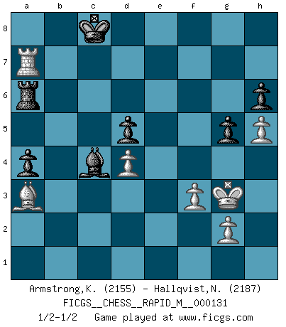 Last move : 1/2-1/2 2022 July 28 0:34:6 [Event "FICGS__CHESS__RAPID_M__000131"] [Site "FICGS"] [Date "2022.06.07"] [Round "1"] [White "Armstrong,Keith"] [Black "Hallqvist,Niklas"] [Result "1/2-1/2"] [WhiteElo "2155"] [BlackElo "2187"] 1.e4 e6 2.d4 d5 3.Nc3 Bb4 4.e5 c5 5.a3 Bxc3+ 6.bxc3 Ne7 7.Qg4 cxd4 8.Bd3 Qa5 9.Rb1 Qxc3+ 10.Bd2 Qc7 11.Nf3 Ng6 12.O-O Nc6 13.Rfe1 Bd7 14.h4 O-O-O 15.c3 Ngxe5 16.Nxe5 Nxe5 17.Rxe5 Qxe5 18.Bf4 f5 19.Qg3 Qf6 20.Bg5 f4 21.Bxf4 Bc6 22.Be5 Qe7 23.cxd4 Rhf8 24.a4 g6 25.a5 a6 26.Rb6 Kd7 27.Bc2 Ke8 28.Bd1 Rc8 29.Bg4 Kd7 30.Bh3 Rg8 31.Kh1 Rcf8 32.Bg4 g5 33.h5 Rf4 34.f3 h6 35.Rb1 Qf7 36.Qe1 Rf5 37.Qe3 Rc8 38.Re1 Bb5 39.Kg1 Rc6 40.Bb8 b6 41.axb6 Rxb6 42.Bxf5 Qxf5 43.Be5 Qd3 44.Bg7 Qxe3+ 45.Rxe3 e5 46.Rxe5 Bc4 47.Bf8 a5 48.Re7+ Kd8 49.Ra7 Ke8 50.Ba3 Ra6 51.Re7+ Kd8 52.Kf2 a4 53.Kg3 Rb6 54.Ra7 Ra6 55.Rf7 Kc8 56.Re7 Rb6 57.Ra7 Ra6 1/2-1/2 French : Winawer, Advance, poisoned pawn variation Kingside Castling by player White (move 12) Queenside Castling by player Black (move 14) This chess game ended in a draw. Follow this game move after move (download)All that matters on the Chessboard is good moves. (Bobby Fischer) Im Blitz ist es einfacher mit einer Figur weniger anzugreifen, als sich mit einer Mehrfigur zu verteidigen. (Mikhail Nekhemyevich Tal) Un jugador que trata de regresar una movida en el Ajedrez es un futuro carterista. (Richard Fenton) Horreur, mais aussi harmonie suprême : qu'y avait-il en effet au monde en dehors des échecs ? Le brouillard, l'inconnu, le non-être... (Vladimir Nabokov) The real voyage of discovery consists not in seeking new lands but in seeing with new eyes. (Marcel Proust)