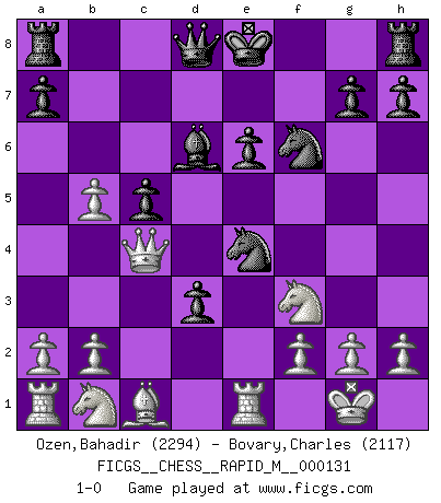 Last move : 1-0 2022 July 13 12:26:10 [Event "FICGS__CHESS__RAPID_M__000131"] [Site "FICGS"] [Date "2022.06.07"] [Round "1"] [White "Ozen,Bahadir"] [Black "Bovary,Charles"] [Result "1-0"] [WhiteElo "2294"] [BlackElo "2117"] 1.d4 Nf6 2.c4 e6 3.Nf3 c5 4.d5 b5 5.dxe6 fxe6 6.cxb5 d5 7.Nc3 Nbd7 8.e4 d4 9.Nb1 Bb7 10.Bd3 Bxe4 11.Bxe4 Nxe4 12.O-O Bd6 13.Re1 Ndf6 14.Qc2 d3 15.Qc4 1-0 Blumenfeld counter-gambit accepted Kingside Castling by player White (move 12) Player White won this chess game. Follow this game move after move (download)Chess mastery essentially consists of analyzing Chess positions accurately. (Mikhail Botvinnik) Die Elozahlen sind sehr schlecht für das Schach. Jetzt ist Schach eine Sportindustrie, die darauf zielt Elopunkte zu machen. (Miguel Najdorf) Todavía soy una víctima del Ajedrez. Tiene toda la belleza del arte y mucho mas. No puede ser comercializado. El Ajedrez es mas puro que el arte en su posición social. (Marcel Duchamp) L'attaque fait le spectacle, la défense gagne les matchs. (Dicton footballistique) A specialist learns more and more about less and less until he knows everything about nothing. (Nicholas Murray Butler)