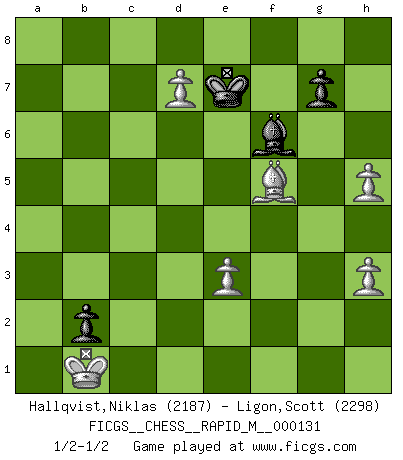 Last move : 1/2-1/2 2022 July 7 10:8:37 [Event "FICGS__CHESS__RAPID_M__000131"] [Site "FICGS"] [Date "2022.06.07"] [Round "1"] [White "Hallqvist,Niklas"] [Black "Ligon,Scott"] [Result "1/2-1/2"] [WhiteElo "2187"] [BlackElo "2298"] 1.d4 Nf6 2.c4 e6 3.g3 d5 4.Bg2 Bb4+ 5.Bd2 Be7 6.Qc2 c6 7.Nf3 O-O 8.O-O Nbd7 9.Bf4 b6 10.Rd1 Bb7 11.Ne5 Nh5 12.Bd2 Nhf6 13.cxd5 cxd5 14.Nc6 Bxc6 15.Qxc6 Rc8 16.Qb5 Ne8 17.e3 Nd6 18.Qe2 Rc2 19.Qd3 Rc6 20.Na3 Qb8 21.Rac1 Rfc8 22.Bf1 h5 23.Nb5 Nc4 24.Qe2 Nxd2 25.Rxc6 Rxc6 26.Qxd2 a6 27.Nc3 Bb4 28.Rc1 Qc8 29.a4 h4 30.gxh4 Nf6 31.Qe2 e5 32.dxe5 Ne4 33.f3 Bxc3 34.fxe4 Bxe5 35.Rxc6 Qxc6 36.exd5 Qxa4 37.Qxa6 Qxa6 38.Bxa6 Bxb2 39.d6 Kf8 40.Bb5 f5 41.h5 Kf7 42.Bc4+ Ke8 43.Be6 b5 44.Bxf5 Ba3 45.d7+ Ke7 46.Kf1 Bd6 47.h3 b4 48.Ke2 b3 49.Kd1 b2 50.Kc2 Be5 51.Kb1 Bf6 1/2-1/2 Catalan : Closed Kingside Castling by player Black (move 7) Kingside Castling by player White (move 8) 10 pieces endgame at move 44 : White KBPPPP , Black KBPP WHITE : King + 1 Bishop 4 Pawns BLACK : King + 1 Bishop 2 Pawns This chess game ended in a draw. Follow this game move after move (download)Your body has to be in top condition. Your Chess deteriorates as your body does. You can't separate body from mind. (Bobby Fischer) Mit Schach schule ich mein Gefühl für Geometrie, was für Tennis und Schach gleichermaßen wichtig ist. (Boris Becker) Vive, pierde y aprende al observar a tu oponente como ganar. (Amber Steenbock) Toutes choses étant égales, c'est la conviction qui gagne. Alliée à une volonté de vaincre, elle sert de détonateur, suscite des idées, disperse les doutes et aide à penser clairement. (Robert Fischer) There is a great deal of difference between an eager man who wants to read a book and a tired man who wants a book to read. (G.K. Chesterton)