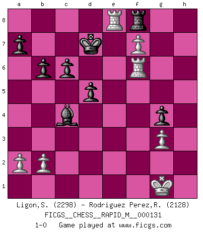 Last move : 1-0 2022 July 21 9:7:25 [Event "FICGS__CHESS__RAPID_M__000131"] [Site "FICGS"] [Date "2022.06.07"] [Round "1"] [White "Ligon,Scott"] [Black "Rodriguez Perez,Rene"] [Result "1-0"] [WhiteElo "2298"] [BlackElo "2128"] 1.c4 e6 2.d4 f5 3.g3 Nf6 4.Bg2 c6 5.Nd2 d5 6.Nh3 Bd6 7.O-O h6 8.Qc2 Qe7 9.Nf3 g5 10.Ne5 Rg8 11.f4 g4 12.Nf2 h5 13.Bd2 h4 14.gxh4 Qh7 15.Be1 Be7 16.Nd1 Nbd7 17.cxd5 Nxd5 18.e4 Nxe5 19.dxe5 fxe4 20.Bxe4 Qh6 21.Qb3 b6 22.Rc1 Bxh4 23.Bxh4 Qxh4 24.Qg3 Qxg3+ 25.hxg3 Bb7 26.Bxd5 exd5 27.Ne3 Kd7 28.Rcd1 Ke6 29.Rde1 Ba6 30.f5+ Kxe5 31.Rf4 Kd6 32.f6 Rg5 33.f7 Rf8 34.Nf5+ Rxf5 35.Rxf5 Kd7 36.Rf6 Bc4 37.Re8 1-0 English Opening Kingside Castling by player White (move 7) Player White won this chess game. Follow this game move after move (download)Winning isn't everything... but losing is nothing. (Mednis) Das ganze Leben mit einer Ehefrau ist wie ein Endspiel mit ungleichfarbigen Läufern. (Viktor Kortschnoi) Dios mío, Bobby Fischer juega tan simple. (Alexei Suetin) Je ne crois pas en la psychologie, je crois aux bons coups. (Robert Fischer) Being number two sucks. (Andre Agassi)