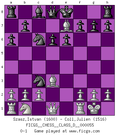 Last move : 0-1 2007 October 14 18:38:39 [Event "FICGS__CHESS__CLASS_D__000055"] [Site "FICGS"] [Date "2007.08.02"] [Round "1"] [White "Szasz,Istvan"] [Black "Coll,Julien"] [Result "0-1"] [WhiteElo "1600"] [BlackElo "1516"] 1.e4 c5 2.Nf3 e6 3.d4 cxd4 4.Nxd4 Nc6 5.Nb5 d6 6.Bd3 a6 7.N5c3 Nf6 8.O-O Be7 9.Bg5 Nxe4 10.Bxe7 Nxc3 0-1 Sicilian, Szen (`anti-Taimanov') variation Kingside Castling by player White (move 8) Player Black won this chess game. Follow this game move after move (download)White lost because he failed to remember the right continuation and had to think up the moves himself. (Siegbert Tarrasch) Frage des Reporters: -Welche besonderen Umstände rechtfertigen das Anhalten der Uhren während einer Turnierpartie? Antwort: -Einen Fotographen zu strangulieren. (Siegbert Tarrasch) Prefiero perder una partida realmente buena, que ganar una mala. (David Levy) Le succès, c'est être capable d'aller d'échec en échec sans perdre son enthousiasme. (Winston Churchill) Everybody lies. (Gregory House, House M.D.)