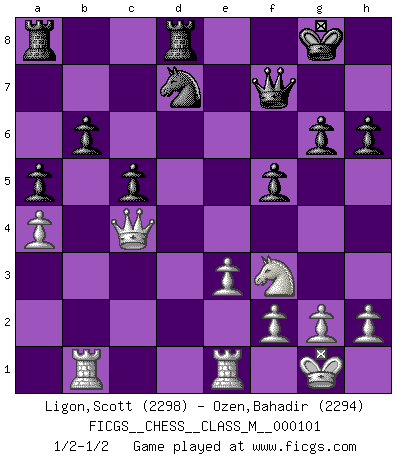 Last move : 1/2-1/2 2022 June 26 15:52:56 [Event "FICGS__CHESS__CLASS_M__000101"] [Site "FICGS"] [Date "2022.06.09"] [Round "1"] [White "Ligon,Scott"] [Black "Ozen,Bahadir"] [Result "1/2-1/2"] [WhiteElo "2298"] [BlackElo "2294"] 1.d4 d5 2.c4 e6 3.Nc3 c6 4.Nf3 Nf6 5.Bg5 h6 6.Bxf6 Qxf6 7.e3 Nd7 8.Qc2 g6 9.a4 a5 10.Bd3 Bg7 11.O-O O-O 12.b3 Qe7 13.Rad1 Rd8 14.Rfe1 dxc4 15.bxc4 b6 16.Be4 Bb7 17.Rb1 f5 18.Bd3 c5 19.d5 Bxc3 20.Qxc3 exd5 21.cxd5 Bxd5 22.Bc4 Bxc4 23.Qxc4+ Qf7 1/2-1/2 QGD : Semi-Slav Kingside Castling by player White (move 11) Kingside Castling by player Black (move 11) This chess game ended in a draw. Follow this game move after move (download)The passion for playing Chess is one of the most unaccountable in the world. (H.G. Wells) Früher wurde jeder komplizierte Zug, jedes interessante Opfer mit großem Beifall und Enthusiasmus aufgenommen. Heute schaltet man einfach seinen Fritz an, und man kann sehen, was los ist, ob der Zug geht oder nicht. (Vladimir Kramnik) Los problemas de Ajedrez exigen del compositor las mismas virtudes que caracterizan todo el arte de valor: originalidad, invención, concisión, armonía, complejidad e insinceridad explendida. (Vladimir Nabokov) Les Echecs mettent en conflit, non pas deux intelligences, mais deux volontés. (Lasker) There are lots of people who mistake their imagination for their memory. (Josh Bilings)