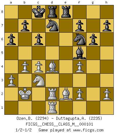 Last move : 1/2-1/2 2022 October 9 9:16:8 [Event "FICGS__CHESS__CLASS_M__000101"] [Site "FICGS"] [Date "2022.06.09"] [Round "1"] [White "Ozen,Bahadir"] [Black "Duttagupta,Aniruddha"] [Result "1/2-1/2"] [WhiteElo "2294"] [BlackElo "2235"] 1.d4 d5 2.c4 c6 3.Nc3 e6 4.e4 dxe4 5.Nxe4 Bb4+ 6.Nc3 e5 7.Be3 exd4 8.Qxd4 Qxd4 9.Bxd4 Nf6 10.Nge2 Be6 11.a3 Bd6 12.O-O-O Bc7 13.g3 Nbd7 14.Nf4 Bxf4+ 15.gxf4 O-O-O 16.Be2 g6 17.Rd2 Rhe8 18.b4 Bf5 19.Rhd1 a6 20.Kb2 1/2-1/2 QGD Slav defense Queenside Castling by player White (move 12) Queenside Castling by player Black (move 15) This chess game ended in a draw. Follow this game move after move (download)Fischer is under obligation to nobody. (Joseph Platz) Ein Kibitz ist einer, der deinem Gegner gute Ratschläge gibt. (Andrew Soltis) Aquellos que dicen entender al Ajedrez, no entienden nada. (Robert Hubner) Si je n'étais pas joueur d'échecs, je serais le meilleur dans quelque chose d'autre. (Anatoli Karpov) When I took office, only high energy physicists had ever heard of what is called the World Wide Web... Now even my cat has its own page. (Bill Clinton, 1996)