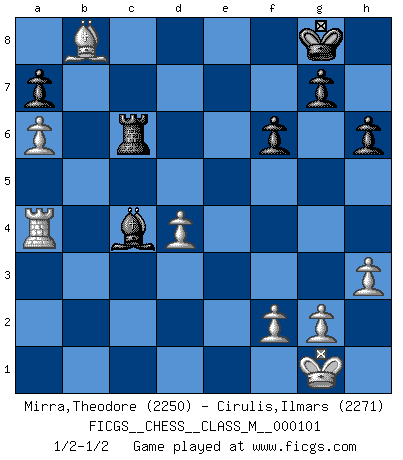 Last move : 1/2-1/2 2022 June 30 13:53:8 [Event "FICGS__CHESS__CLASS_M__000101"] [Site "FICGS"] [Date "2022.06.09"] [Round "1"] [White "Mirra,Theodore"] [Black "Cirulis,Ilmars"] [Result "1/2-1/2"] [WhiteElo "2250"] [BlackElo "2271"] 1.e4 e5 2.Nf3 Nc6 3.Bb5 Nf6 4.O-O Nxe4 5.Re1 Nd6 6.Nxe5 Be7 7.Bf1 Nxe5 8.Rxe5 O-O 9.d4 Bf6 10.Re1 Re8 11.c3 Rxe1 12.Qxe1 Nf5 13.Bf4 c6 14.Nd2 d5 15.a4 Nd6 16.a5 Bf5 17.Nf3 h6 18.a6 b6 19.h3 Rc8 20.Qd1 Be6 21.b4 Ne4 22.Qe1 c5 23.bxc5 bxc5 24.Bd3 Qb6 25.Bxe4 dxe4 26.Qxe4 cxd4 27.cxd4 Qc6 28.Qxc6 Rxc6 29.Ne5 Bxe5 30.Bxe5 Bc4 31.Ra4 f6 32.Bb8 1/2-1/2 Ruy Lopez : Berlin defense, Open variation Kingside Castling by player White (move 4) Kingside Castling by player Black (move 8) This chess game ended in a draw. Follow this game move after move (download)Suddenly it was obvious to me in my analysis I had missed what Fischer had found with the greatest of ease at the board. (Mikhail Botvinnik) Es hat in meinem Leben Zeiten gegeben, in denen das Schachspiel, wenn nicht zum Lebenszweck, so doch zu einem regelrechten Lebensersatz geworden ist. Man fühlt sich in solchen Zeiten nicht so, als besäße man eine göttliche Gabe, sondern eher so, als sei man von ihr besessen. (Garry Kasparov) El tablero es el mundo, las piezas es el fenomeno del universo, las reglas del juego son lo que llamamos leyes de la naturaleza y el jugador del lado opuesto, se encuentra oculto a nuestra vista. (Thomas Huxley) La tactique est l'élément le plus important du milieu de jeu. (Siegbert Tarrasch) Kids, you tried your best and you failed miserably. The lesson is, never try. (Simpsons)