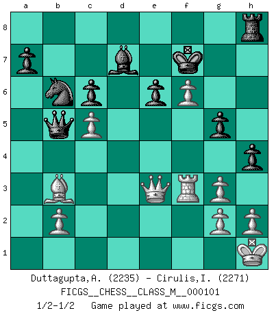 Last move : 1/2-1/2 2022 December 18 15:44:40 [Event "FICGS__CHESS__CLASS_M__000101"] [Site "FICGS"] [Date "2022.06.09"] [Round "1"] [White "Duttagupta,Aniruddha"] [Black "Cirulis,Ilmars"] [Result "1/2-1/2"] [WhiteElo "2235"] [BlackElo "2271"] 1.d4 f5 2.Bg5 h6 3.Bh4 g5 4.e4 Bg7 5.Bg3 d6 6.Bc4 d5 7.Bxd5 e6 8.Qh5+ Kf8 9.Bb3 f4 10.c3 fxg3 11.fxg3 Nf6 12.Qe2 c5 13.Nf3 Nc6 14.e5 Nd5 15.O-O Kg8 16.Nbd2 cxd4 17.Nxd4 Bd7 18.Rf2 Qe7 19.Nxc6 bxc6 20.Raf1 Rf8 21.Rxf8+ Bxf8 22.c4 Nb6 23.Ne4 Bg7 24.Nf6+ Bxf6 25.exf6 Qc5+ 26.Kh1 h5 27.a4 Kf7 28.a5 Qxa5 29.Qe3 h4 30.c5 Qb5 31.Rf3 1/2-1/2 Dutch, 2.Bg5 variation Kingside Castling by player White (move 15) This chess game ended in a draw. Follow this game move after move (download)It's just you and your opponent at the board and you're trying to prove something. (Bobby Fischer) Ich spiele ehrlich und spiele, um zu gewinnen. Wenn ich verliere nehme ich meine Medizin. (Robert James Fischer) Bobby es la celebridad menos entendida y malinterpretada que camina el la faz de esta tierra. (Yasser Seirawan) La solitude du joueur d'Echecs à l'approche du mat est semblable à celle du condamné. (Francis Szpiner) All men can see these tactics whereby I conquer, but what none can see is the strategy out of which victory is evolved. (Sun Tzu)