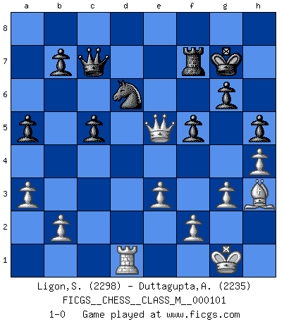 Last move : 1-0 2022 November 15 10:31:52 [Event "FICGS__CHESS__CLASS_M__000101"] [Site "FICGS"] [Date "2022.06.09"] [Round "1"] [White "Ligon,Scott"] [Black "Duttagupta,Aniruddha"] [Result "1-0"] [WhiteElo "2298"] [BlackElo "2235"] 1.c4 e5 2.Nc3 Nf6 3.Nf3 Nc6 4.g3 d5 5.cxd5 Nxd5 6.Bg2 Nb6 7.O-O Be7 8.d3 O-O 9.Be3 Be6 10.a3 a5 11.Bxb6 cxb6 12.Qa4 Rc8 13.Rac1 g6 14.e3 Qxd3 15.Rfd1 Qf5 16.h3 h5 17.Nh4 Qf6 18.Qb5 Bc5 19.Nf3 Qe7 20.h4 Na7 21.Qf1 f6 22.Nd2 Kg7 23.Nde4 Bb3 24.Nd5 Qf7 25.Nxc5 bxc5 26.Nb6 Bxd1 27.Nxc8 Nxc8 28.Rxd1 Qc7 29.Qd3 Rf7 30.Bh3 f5 31.Qc3 Nd6 32.Qxe5+ 1-0 English Opening Kingside Castling by player White (move 7) Kingside Castling by player Black (move 8) Player White won this chess game. Follow this game move after move (download)We cannot resist the fascination of sacrifice, since a passion for sacrifices is part of a Chessplayer's nature. (Rudolf Spielman) Wer nie einen Fehler gemacht hat, hat nie etwas Neues ausprobiert. (Albert Einstein) El Ajedrez es un juego de pelea el cual es puramente intelectual e incluye la suerte. (Richard Reti) Pour moi, les échecs ne sont pas un jeu mais un art. (Alexandre Alekhine) The problem with manipulation is that people can turn on you. (Horatio Caine, C.S.I. Miami)