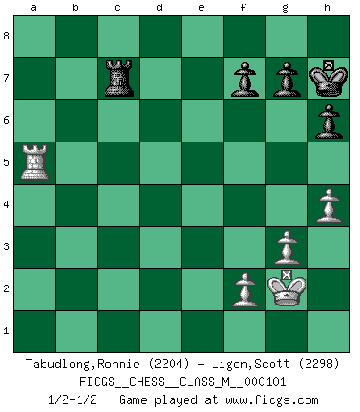 Last move : 1/2-1/2 2022 July 9 5:23:31 [Event "FICGS__CHESS__CLASS_M__000101"] [Site "FICGS"] [Date "2022.06.09"] [Round "1"] [White "Tabudlong,Ronnie"] [Black "Ligon,Scott"] [Result "1/2-1/2"] [WhiteElo "2204"] [BlackElo "2298"] 1.d4 Nf6 2.c4 e6 3.Nc3 Bb4 4.e3 O-O 5.Bd3 d5 6.Nf3 dxc4 7.Bxc4 c5 8.O-O cxd4 9.exd4 b6 10.Bg5 Bb7 11.Qe2 Nbd7 12.Rac1 Bxc3 13.bxc3 Qc7 14.Bd3 Ng4 15.Be4 Bxe4 16.Qxe4 Ngf6 17.Qe2 Qc6 18.c4 Rac8 19.Qb2 h6 20.Bf4 Rfd8 21.Rfe1 Nb8 22.Be5 Nbd7 23.Bg3 Ne4 24.Bf4 Qb7 25.a4 Ndf6 26.h3 Nd6 27.Bxd6 Rxd6 28.a5 Qa6 29.Qb3 Nd7 30.axb6 axb6 31.Rc3 Qb7 32.Rec1 Qa7 33.Qb2 Qc7 34.Qa2 Rc6 35.Qe2 Qd6 36.Qd3 Rd8 37.Qe3 Rdc8 38.Nd2 Nf6 39.Nf3 Nd7 40.R1c2 Rd8 41.g3 Rc7 42.Kh2 Ra8 43.Nd2 e5 44.Rd3 Qg6 45.Rb2 Rac8 46.dxe5 Nxe5 47.Rd5 Nxc4 48.Nxc4 Rxc4 49.Rxb6 Qc2 50.Rbd6 Rf8 51.Rd8 Rxd8 52.Rxd8+ Kh7 53.Qf3 Rc7 54.Kg2 Qc6 55.Rd5 Kg8 56.Ra5 Qxf3+ 57.Kxf3 Rc3+ 58.Kg2 Kh7 59.h4 Rc7 60.Kf3 Rc3+ 61.Kg2 Rc7 1/2-1/2 Nimzo-Indian : 4.e3 O-O, 5.Bd3 d5 Kingside Castling by player Black (move 4) Kingside Castling by player White (move 8) 10 pieces endgame at move 57 : White KRPPP , Black KRPPP WHITE : King + 1 Rook 3 Pawns BLACK : King + 1 Rook 3 Pawns This chess game ended in a draw. Follow this game move after move (download)The laws of Chess do not permit a free choice: you have to move whether you like it or not. (Emanuel Lasker) Karpov ist ein Museumsstück. (Garry Kasparov) El Ajedrez no es una pizca de inferior al violín, y tenemos un gran número de violinistas profesionales. (Mikhail Botvinnik) Les Echecs, c'est l'art de la guerre sans les charniers, c'est la résurrection des morts tombés au champ d'honneur, l'espoir perpétuel, la suprématie de l'intelligence sur la force, la culture de l'esprit. (F. Szpiner) Man with more than one clock never knows what time it is. (Chinese thought)