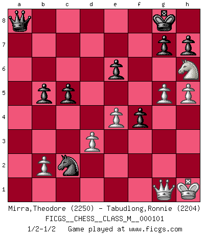 Last move : 1/2-1/2 2022 July 2 15:2:1 [Event "FICGS__CHESS__CLASS_M__000101"] [Site "FICGS"] [Date "2022.06.09"] [Round "1"] [White "Mirra,Theodore"] [Black "Tabudlong,Ronnie"] [Result "1/2-1/2"] [WhiteElo "2250"] [BlackElo "2204"] 1.e4 c5 2.Nc3 Nc6 3.Nf3 e5 4.Bc4 Be7 5.d3 d6 6.Nd2 Nf6 7.Nf1 Bg4 8.f3 Be6 9.Ne3 a6 10.a4 Rb8 11.O-O O-O 12.g3 Qd7 13.Kh1 Bd8 14.Bd2 Kh8 15.Rf2 Qc8 16.Qg1 Ba5 17.f4 b5 18.axb5 Bxc3 19.Bxc3 axb5 20.Bxe6 fxe6 21.fxe5 dxe5 22.g4 Nd7 23.Raf1 Rxf2 24.Rxf2 Qb7 25.h4 Rf8 26.g5 Kg8 27.Be1 Qa8 28.Rxf8+ Nxf8 29.Bf2 Nd4 30.Ng4 Ng6 31.h5 Nf4 32.Be3 Nxc2 33.Bxf4 exf4 34.Nh6+ Kh8 35.Nf7+ Kg8 36.Nh6+ Kh8 37.Nf7+ Kg8 38.Nh6+ 1/2-1/2 Sicilian : Closed, 2...Nc6 Kingside Castling by player White (move 11) Kingside Castling by player Black (move 11) This chess game ended in a draw. Follow this game move after move (download)The passed pawn is a criminal, who should be kept under lock and key. Mild measures, such as police surveillance, are not sufficient. (Nimzovitch) Auf jeden Fall musst du zuerst Rechtsanwalt werden, damit du deine eigenen Interessen und die deiner Familie vertreten kannst. [Brief an seinen Sohn] (José Raúl Capablanca) El Ajedrez es imaginación. (David Bronstein) Un millionnaire : 'Monsieur Steinitz ! Vous ne participez aux tournois que pour l'argent, alors que moi je n'y viens que pour l'honneur.' Steinitz : 'Chacun joue pour ce qu'il n'a pas'... I've never seen so many men wasted so badly. (Blondie in The Good, The Bad and The Ugly)