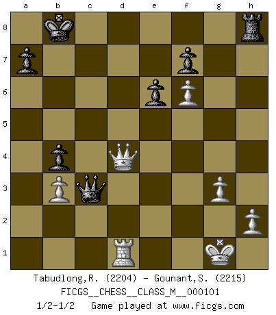 Last move : 1/2-1/2 2022 July 13 6:28:10 [Event "FICGS__CHESS__CLASS_M__000101"] [Site "FICGS"] [Date "2022.06.09"] [Round "1"] [White "Tabudlong,Ronnie"] [Black "Gounant,Stanislas"] [Result "1/2-1/2"] [WhiteElo "2204"] [BlackElo "2215"] 1.d4 d5 2.c4 c6 3.Nf3 Nf6 4.Nc3 e6 5.Bg5 dxc4 6.e4 b5 7.e5 h6 8.Bh4 g5 9.Nxg5 hxg5 10.Bxg5 Nbd7 11.g3 Bb7 12.Bg2 Qb6 13.exf6 O-O-O 14.O-O c5 15.d5 b4 16.Na4 Qb5 17.a3 Nb8 18.axb4 cxb4 19.Qg4 Bxd5 20.Rfc1 Nc6 21.Bxd5 Rxd5 22.Rxc4 Rxg5 23.Qd4 Kb8 24.Rxc6 Rxg3+ 25.fxg3 Qxc6 26.Rd1 Qc7 27.b3 Kc8 28.Qe3 Kb8 29.Qd4 Kc8 30.Qe4 Kb8 31.Qd3 Bc5+ 32.Nxc5 Qxc5+ 33.Qd4 Qc3 1/2-1/2 QGD Slav : 4.Nc3 Queenside Castling by player Black (move 13) Kingside Castling by player White (move 14) This chess game ended in a draw. Follow this game move after move (download)It is not a move, even the best move that you must seek, but a realizable plan. (Eugene Znosko-Borovsky) Obwohl ich vom Stil her kaum zu den Priestern der Schachkunst gezählt werde, halte ich Schach doch für eine Kunst. (Tigran Petrosjan) Durante una competencia de Ajedrez, un Maestro de Ajedrez deberá ser una combinación de presa de caza y un Monge. (Alexander Alekhine) L'action d'une oeuvre littéraire se déroule sur un champ de bataille. Les masques et les types du drame moderne correspondent aux pièces du jeu d'échecs. L'intrigue correspond aux coups et aux gambits, c'est à dire aux techniques du jeu telles qu'utilisées et interprétées par les joueurs. Les tactiques et les péripéties [mouvements] correspondent aux coups exécutés par l'adversaire. (Viktor Shklovsky) There are two major products that came out of Berkeley: LSD and UNIX. We do not believe this is to be a coincidence. (Jeremy S. Anderson)