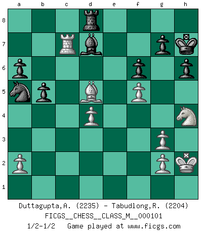 Last move : 1/2-1/2 2022 December 27 15:40:21 [Event "FICGS__CHESS__CLASS_M__000101"] [Site "FICGS"] [Date "2022.06.09"] [Round "1"] [White "Duttagupta,Aniruddha"] [Black "Tabudlong,Ronnie"] [Result "1/2-1/2"] [WhiteElo "2235"] [BlackElo "2204"] 1.e4 c5 2.Nc3 Nc6 3.Bb5 Nd4 4.Nf3 a6 5.Bd3 e6 6.O-O Nc6 7.Be2 Nd4 8.d3 Ne7 9.Bg5 Qc7 10.Nxd4 cxd4 11.Nb1 Nc6 12.Nd2 h6 13.Bh4 Bd6 14.Bg3 Bxg3 15.hxg3 d6 16.c3 O-O 17.f4 Bd7 18.Rc1 Qb6 19.Kh2 Rac8 20.Qe1 Na5 21.Rb1 dxc3 22.bxc3 Qc7 23.Rc1 b5 24.Nf3 e5 25.Qf2 Rfe8 26.Nh4 Qc5 27.Qe1 Rc7 28.f5 d5 29.Bf3 dxe4 30.Bxe4 f6 31.d4 exd4 32.cxd4 Qxc1 33.Qxc1 Rxc1 34.Bd5+ Kh7 35.Rxc1 Rd8 36.Rc7 1/2-1/2 Sicilian : Closed, 2...Nc6 Kingside Castling by player White (move 6) Kingside Castling by player Black (move 16) This chess game ended in a draw. Follow this game move after move (download)When asked, -How is that you pick better moves than your opponents?, I responded: I'm very glad you asked me that, because, as it happens, there is a very simple answer. I think up my own moves, and I make my opponent think up his. (Alexander Alekhine) Modernes Schach sorgt sich zuviel um Dinge wie Bauernstruktur usw. Vergessen Sie das, Schachmatt beendet das Spiel! (Nigel Short) El Ajedrez es tan inspirador que yo no creo que un buen jugador sea capaz de tener un pensamiento malo durante una partida. (Wilhelm Steinitz) Le joueur d'Echecs qui veut atteindre le top est obligé de développer son propre credo créatif. Alexeï Stepanovicth Souétine. Il est facile d'écrire des livres ! Ce qui est difficile, c'est de jouer ! (Alexeï Stepanovicth Souétine) I fear not the man who has practiced 10,000 kicks once, but I fear the man who has practiced one kick 10,000 times. (Bruce Lee)
