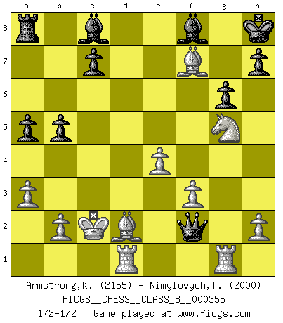 Last move : 1/2-1/2 2022 July 26 2:26:9 [Event "FICGS__CHESS__CLASS_B__000355"] [Site "FICGS"] [Date "2022.06.11"] [Round "1"] [White "Armstrong,Keith"] [Black "Nimylovych,Taras"] [Result "1/2-1/2"] [WhiteElo "2155"] [BlackElo "2000"] 1.d4 Nf6 2.Nf3 d5 3.c4 e6 4.Nc3 Bb4 5.Qa4+ Nc6 6.e3 O-O 7.Qc2 Re8 8.Bd2 Bf8 9.a3 e5 10.dxe5 Nxe5 11.cxd5 Nxf3+ 12.gxf3 Nxd5 13.O-O-O a5 14.Bc4 Nb6 15.Bd3 Qh4 16.Ne4 Re6 17.Rhg1 g6 18.Bb5 Nd5 19.Ng5 Rb6 20.Bc4 Rc6 21.e4 b5 22.Bxd5 Rxc2+ 23.Kxc2 Qxf2 24.Bxf7+ Kh8 25.Rgf1 Qg2 26.Rg1 Qf2 1/2-1/2 Queen's pawn game Kingside Castling by player Black (move 6) Queenside Castling by player White (move 13) This chess game ended in a draw. Follow this game move after move (download)Bobby Fischer is the greatest Chess player who has ever lived. (Ken Smith) Ich habe Putins Aufstieg an die Macht beobachtet und seine Politik, die demokratischen Institutionen meines Landes zu zerstören. (Garry Kasparov) Las Aperturas te enseñan aperturas. ¡Los Finales te enseñan Ajedrez!. (Stephan Gerzadowicz) Ne tendez aucun piège pour le plaisir ! Ne jouez rien dans l'espoir que l'adversaire réagisse de façon stupide ! Prenez toujours pour acquis que l'adversaire va trouver le meilleur coup ! Ne jouez jamais de coup dans l'espoir que l'adversaire ne voie pas la menace ! Chacun de vos coups doit améliorer la position d'une façon ou d'une autre. A good aphorism is too hard for the tooth of time, and is not worn away with the centuries, although it serves as food for every speech. (Friedrich Nietzsche)