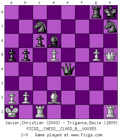Last move : 1-0 2022 September 24 7:46:26 [Event "FICGS__CHESS__CLASS_B__000355"] [Site "FICGS"] [Date "2022.06.11"] [Round "1"] [White "Javier,Christian"] [Black "Trigance,Emile"] [Result "1-0"] [WhiteElo "2003"] [BlackElo "1809"] 1.Nf3 d5 2.d4 Nf6 3.c4 c6 4.e3 Bf5 5.Nc3 e6 6.Nh4 Be4 7.f3 Bg6 8.Bd2 Bd6 9.Qb3 Qc7 10.Rc1 Qd7 11.Nxg6 hxg6 12.g4 Na6 13.cxd5 exd5 14.Kd1 O-O 15.Kc2 Rfe8 16.h4 b5 17.Kb1 Nc7 18.Qc2 a5 19.h5 gxh5 20.g5 Nh7 21.Bd3 g6 22.Bxg6 fxg6 23.Qxg6+ Kh8 24.Qxh5 Qf5+ 25.e4 dxe4 26.fxe4 Rxe4 27.Nxe4 Qxe4+ 28.Ka1 Rg8 29.d5 1-0 Reti Opening Kingside Castling by player Black (move 14) Player White won this chess game. Follow this game move after move (download)The tactician must know what to do whenever something needs doing; the strategist must know what to do when nothing needs doing. (Savielly Tartakover) Ein unbeabsichtigtes Patt ist der Gipfel der Dummheit. (Anonymous) Nunca nadie ha ganado una partida de Ajedrez rindiendose. (Unknown) Les Echecs, c'est l'art de la guerre sans les charniers, c'est la résurrection des morts tombés au champ d'honneur, l'espoir perpétuel, la suprématie de l'intelligence sur la force, la culture de l'esprit. (F. Szpiner) A good player is always lucky. (Capablanca)