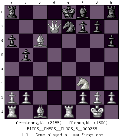Last move : 1-0 2022 July 9 5:3:33 [Event "FICGS__CHESS__CLASS_B__000355"] [Site "FICGS"] [Date "2022.06.11"] [Round "1"] [White "Armstrong,Keith"] [Black "Olonan,Wilfredo Olanka"] [Result "1-0"] [WhiteElo "2155"] [BlackElo "1800"] 1.d4 d5 2.c4 dxc4 3.e4 h6 4.Bxc4 e6 5.Nf3 a6 6.O-O c6 7.Nc3 b5 8.Bb3 Bb7 9.d5 cxd5 10.exd5 exd5 11.Re1+ Ne7 12.Nxd5 Bxd5 13.Bxd5 Nbc6 14.Bxc6+ Qd7 15.Qxd7+ 1-0 QGA : 3.e4 Kingside Castling by player White (move 6) Player White won this chess game. Follow this game move after move (download)It's always better to sacrifice your opponent's men. (Savielly Tartakover) Später, ... hatte ich zunehmend Erfolg in entscheidenden Partien. Vielleicht weil ich eine einfache Wahrheit erkannte: nicht nur ich hatte Angst, auch mein Gegner. (Mikhail Nekhemyevich Tal) Con el fin de mejorar tu juego, debes de estudiar los finales antes que todo, ya que mientras que los finales pueden ser estudiados y dominados por sí mismos, el juegomedio y la apertura deben de ser estudiados en relación con los finales. (José Raúl Capablanca) Il n'y a plus de joueurs du niveau de Jacob Murray dont la seule quête est le beau jeu, le plaisir de voir les pièces construire quelque chose. Sur 10 idées à la minute, 9 seront sans intérêt, la dernière s'avèrera géniale. (Christian Bauer) Fortune favours the audacious. (Desiderius Erasmus)