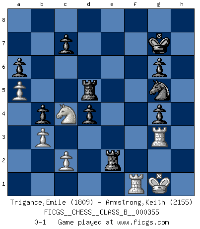 Last move : 0-1 2022 September 12 12:52:29 [Event "FICGS__CHESS__CLASS_B__000355"] [Site "FICGS"] [Date "2022.06.11"] [Round "1"] [White "Trigance,Emile"] [Black "Armstrong,Keith"] [Result "0-1"] [WhiteElo "1809"] [BlackElo "2155"] 1.e4 e5 2.Nf3 Nc6 3.Bb5 a6 4.Ba4 Nf6 5.O-O Be7 6.Re1 b5 7.Bb3 O-O 8.a4 b4 9.d4 d6 10.dxe5 dxe5 11.Nbd2 Bc5 12.h3 h6 13.a5 Qd6 14.Nc4 Qxd1 15.Rxd1 Nxe4 16.Be3 Re8 17.Ncd2 Bxe3 18.fxe3 Nc5 19.Bd5 Bb7 20.Nc4 Rad8 21.e4 g6 22.b3 Kg7 23.Rf1 f6 24.Rf2 Nd4 25.Raf1 Bxd5 26.exd5 Ne4 27.Nxd4 exd4 28.Rf3 Rxd5 29.Kh2 h5 30.Kg1 f5 31.g4 Ng5 32.Rd3 hxg4 33.hxg4 fxg4 34.Rg3 Re2 0-1 Ruy Lopez : Closed, 7...O-O Kingside Castling by player White (move 5) Kingside Castling by player Black (move 7) Player Black won this chess game. Follow this game move after move (download)Could we look into the head of a Chess player, we should see there a whole world of feelings, images, ideas, emotion and passion. (Alfred Binet) Ein Teil des Fehlers ist immer korrekt. (Savielly Grigorievitsch Tartakower) EL Ajedrez es como la vida. (Boris Spassky) La victoire dans une partie d'Echecs appartient la plupart du temps à celui qui voit un peu plus loin que l'adversaire. (Lasker) If you work for a living, why do you kill yourself working ? (Tuco to a chicken in The Good, The Bad and The Ugly)