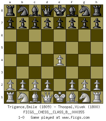 Last move : 1-0 2022 July 21 20:35:4 [Event "FICGS__CHESS__CLASS_B__000355"] [Site "FICGS"] [Date "2022.06.11"] [Round "1"] [White "Trigance,Emile"] [Black "Thoopal,Vivek"] [Result "1-0"] [WhiteElo "1809"] [BlackElo "1800"] 1.e4 1-0 This chess game has been lost on time (started : 2022.06.11 3:35:2) King's pawn Opening Player White won this chess game. Follow this game move after move (download)I give 98 percent of my mental energy to Chess. Others give only 2 percent. (Bobby Fischer) Dein Körper muss in Topform sein. Dein Schach verfällt, wenn dein Körper verfällt. Der Körper kann nicht vom Geist getrennt werden. (Robert James Fischer) La única cosa que los jugadores de Ajedrez tienen en común, es el Ajedrez. (Lodewijk Prins) Les Echecs mettent en conflit, non pas deux intelligences, mais deux volontés. (Lasker) If computers get too powerful, we can organize them into committees. That'll do them in. (Anonymous)