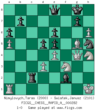 Last move : 1-0 2022 August 23 6:37:15 [Event "FICGS__CHESS__RAPID_A__000282"] [Site "FICGS"] [Date "2022.06.12"] [Round "1"] [White "Nimylovych,Taras"] [Black "Swiatek,Janusz"] [Result "1-0"] [WhiteElo "2000"] [BlackElo "2101"] 1.e4 e5 2.Nf3 Nc6 3.Bc4 Bc5 4.O-O Nf6 5.Re1 O-O 6.d3 d6 7.c3 a6 8.h3 h6 9.a4 Ba7 10.Nbd2 Be6 11.Bxe6 fxe6 12.b4 Nd7 13.Nf1 Qf6 14.N1h2 Qg6 15.Ra2 Ne7 16.Qb3 Qf7 17.Rf1 Nf6 18.Re1 Bb6 19.a5 Ba7 20.Kh1 Ng6 21.g3 Nd7 22.Rg1 Ne7 23.h4 Rac8 24.g4 c5 25.h5 cxb4 26.Qxb4 Nc6 27.Qb3 Qe8 28.g5 hxg5 29.Nxg5 Nd8 30.h6 Rf6 31.Ngf3 Rg6 32.Qd1 Nf6 33.Nh4 Rxg1+ 34.Qxg1 Rc7 35.Bg5 Nh5 36.Ra1 Rxc3 37.Qg4 Bxf2 38.Bxd8 Rc2 39.Bg5 d5 40.N2f3 1-0 Giuoco Piano Kingside Castling by player White (move 4) Kingside Castling by player Black (move 5) Player White won this chess game. Follow this game move after move (download)Dazzling combinations are for the many, shifting wood is for the few. (Georg Kieninger) Im Blitz ist es einfacher mit einer Figur weniger anzugreifen, als sich mit einer Mehrfigur zu verteidigen. (Mikhail Nekhemyevich Tal) El Ajedrez es un mar en el cual un mosquito puede beber y un elefante puede bañarse. (Refrán Hindú) Il n'y a pas eu de défaite parce que je ne crois pas que cet ordinateur ait jamais existé. IBM a triché en refusant d'imprimer les modes de recherche de la machine. C'est évident, pendant le match, des coups décisifs ont été joués par des êtres humains. Aujourd'hui, les meilleurs spécialistes en informatique ne peuvent toujours pas expliquer comment Deep-Blue a pu jouer contre la logique des ordinateurs. IBM a gagné une guerre de communication, mais ils sont incapables de prouver que l'ordinateur a gagné tout seul. (Garry Kasparov) Thibault, I ask for draw. Game 13876. - Sorry Ilmars, you won. (FICGS chat)