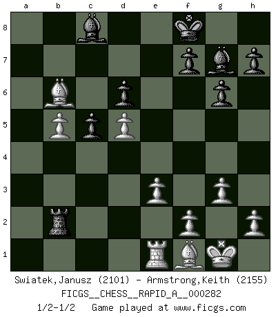 Last move : 1/2-1/2 2022 July 13 23:54:25 [Event "FICGS__CHESS__RAPID_A__000282"] [Site "FICGS"] [Date "2022.06.12"] [Round "1"] [White "Swiatek,Janusz"] [Black "Armstrong,Keith"] [Result "1/2-1/2"] [WhiteElo "2101"] [BlackElo "2155"] 1.d4 Nf6 2.c4 e6 3.g3 c5 4.d5 exd5 5.cxd5 d6 6.Nf3 g6 7.Nc3 Bg7 8.Bg2 O-O 9.O-O Re8 10.a4 Ne4 11.Nxe4 Rxe4 12.Nd2 Rb4 13.Ra2 a5 14.b3 b5 15.axb5 Nd7 16.Qc2 Nb6 17.Re1 a4 18.bxa4 Rbxa4 19.Rxa4 Rxa4 20.Bb2 Ra2 21.Bf6 Rxc2 22.Bxd8 Rxd2 23.Bxb6 Kf8 24.Bf1 Rb2 25.e3 1/2-1/2 Catalan Opening Kingside Castling by player Black (move 8) Kingside Castling by player White (move 9) This chess game ended in a draw. Follow this game move after move (download)By playing at Chess then, we may learn: First: Foresight... Second: Circumspection... Third: Caution... And lastly, we learn by Chess the habit of not being discouraged by present bad appearances in the state of our affairs, the habit of hoping for a favorable chance, and that of persevering in the secrets of resources. (Benjamin Franklin) Moralische Siege zählen nicht. (Savielly Grigorievitsch Tartakower) Cuando me preguntan: -¿Cual es el secreto que te hace hacer mejores movidas que tus oponentes?, Yo respondo: Me da gusto que me pregunten eso, porque, como veran, hay una simple razón. Yo pienso mis propias movidas y dejo a mi oponente que el piense las suyas. (Alexander Alekhine) Nous vivons dans un monde échiquéen : chaque jour qui passe est un défi à relever. (Philosophe Sasha) Art disturbs, science reassures. (Georges Braque, Le Jour et la Nuit)