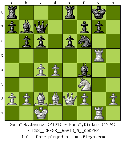 Last move : 1-0 2022 July 3 8:28:18 [Event "FICGS__CHESS__RAPID_A__000282"] [Site "FICGS"] [Date "2022.06.12"] [Round "1"] [White "Swiatek,Janusz"] [Black "Faust,Dieter"] [Result "1-0"] [WhiteElo "2101"] [BlackElo "1974"] 1.d4 d5 2.c4 c6 3.Nc3 Nf6 4.Nf3 e6 5.e3 Nbd7 6.Bd3 Bd6 7.e4 dxe4 8.Nxe4 Nxe4 9.Bxe4 Nf6 10.Bc2 h6 11.Qe2 O-O 12.Bd2 b6 13.Rg1 Bb7 14.g4 Re8 15.O-O-O Qc7 16.g5 hxg5 17.Rxg5 Bf4 18.Rdg1 1-0 QGD Slav defense Kingside Castling by player Black (move 11) Queenside Castling by player White (move 15) Player White won this chess game. Follow this game move after move (download)Chess is imagination. (David Bronstein) Ohne Fehler kann es keine Brillanz geben. (Emanuel Lasker) El muchacho (en ese entonces un niño de 12 años llamado Anatoly Karpov) no tiene ni idea de lo que es el Ajedrez y no hay futuro en absoluto para el en esta profesión. (Mikhail Botvinnik) Avant la finale, les dieux ont créé le milieu de partie. (Tarrasch) The worth of a book is to be measured by what you can carry away from it. (James Bryce)