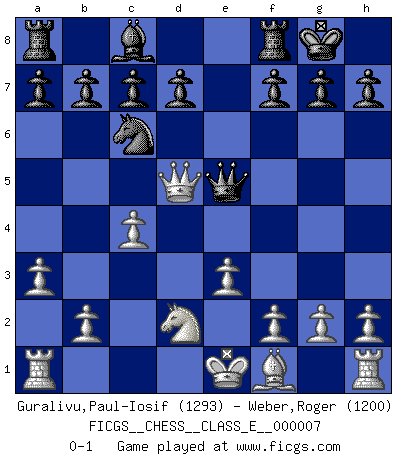 Last move : 0-1 2006 November 6 9:24:19 [Event "FICGS__CHESS__CLASS_E__000007"] [Site "FICGS"] [Date "2006.06.27"] [Round "1"] [White "Guralivu,Paul-Iosif"] [Black "Weber,Roger"] [Result "0-1"] [WhiteElo "1293"] [BlackElo "1200"] 1.d4 Nf6 2.c4 e5 3.dxe5 Ne4 4.Qd5 Bb4+ 5.Bd2 Nxd2 6.Nxd2 Nc6 7.Ngf3 O-O 8.a3 Bxd2+ 9.Nxd2 Qg5 10.e3 Qxe5 0-1 Budapest : Fajarowicz variation Kingside Castling by player Black (move 7) Player Black won this chess game. Follow this game move after move (download)When you don't know what to do, wait for your opponent to get an idea - it's sure to be wrong. (Tarrasch) Auf jeden Fall musst du zuerst Rechtsanwalt werden, damit du deine eigenen Interessen und die deiner Familie vertreten kannst. [Brief an seinen Sohn] (José Raúl Capablanca) Fischer es el jugador mas fuerte del mundo. De hecho, el jugador mas fuerte que jamas haya existido. (Larry Evans) Si rien de grave n'est détecté lors de l'analyse d'une position, on joue alors le coup. Seconde règle de Blumenfeld. Now be brave and don't look back. Don't look back. (Shmi Skywalker in Star Wars ep.1)