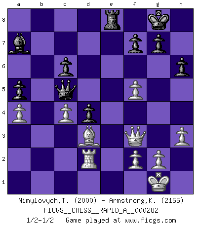 Last move : 1/2-1/2 2022 July 13 23:56:40 [Event "FICGS__CHESS__RAPID_A__000282"] [Site "FICGS"] [Date "2022.06.12"] [Round "1"] [White "Nimylovych,Taras"] [Black "Armstrong,Keith"] [Result "1/2-1/2"] [WhiteElo "2000"] [BlackElo "2155"] 1.e4 e5 2.Nf3 Nc6 3.Bc4 Bc5 4.O-O Nf6 5.d3 d6 6.c3 h6 7.Re1 O-O 8.Nbd2 a6 9.h3 Ba7 10.a3 b5 11.Bb3 a5 12.a4 b4 13.Bc4 Be6 14.Bb5 Ne7 15.d4 c6 16.Bd3 Ng6 17.Nf1 Nh5 18.Ne3 Rb8 19.Nf5 Re8 20.Bd2 Ngf4 21.Bf1 Bxf5 22.exf5 bxc3 23.bxc3 Nd5 24.dxe5 Qb6 25.Nd4 dxe5 26.Qxh5 exd4 27.c4 Nf6 28.Qf3 Qc5 29.Rxe8+ Rxe8 30.Rd1 Ne4 31.Bd3 Nxd2 32.Rxd2 1/2-1/2 Giuoco Piano Kingside Castling by player White (move 4) Kingside Castling by player Black (move 7) This chess game ended in a draw. Follow this game move after move (download)On the chessboard, lies and hypocrisy do not survive long. (Emanuel Lasker) Ich verstehe Aljechins Kombinationen ganz gut; aber woher er diese Angriffschancen bekommt und wie er die Eröffnung behandelt das ist für mich ein Buch mit sieben Siegeln. (Rudolf Spielmann) Evita las multitudes. Haz independientemente tu propio razonamiento. Trata de ser el jugador de Ajedrez, no la pieza de Ajedrez. (Ralph Charell) Pour moi, les échecs ne sont pas un jeu mais un art. (Alexandre Alekhine) If we don't succeed, we run the risk of failure. (George W. Bush)