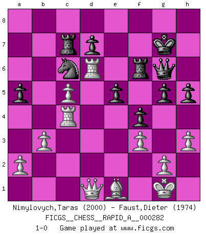 Last move : 1-0 2022 July 28 9:24:48 [Event "FICGS__CHESS__RAPID_A__000282"] [Site "FICGS"] [Date "2022.06.12"] [Round "1"] [White "Nimylovych,Taras"] [Black "Faust,Dieter"] [Result "1-0"] [WhiteElo "2000"] [BlackElo "1974"] 1.e4 c5 2.Nf3 Nc6 3.Bb5 g6 4.O-O Bg7 5.Bxc6 bxc6 6.Re1 Nh6 7.h3 O-O 8.c3 f5 9.e5 Nf7 10.d4 cxd4 11.cxd4 Bb7 12.Na3 c5 13.dxc5 Rc8 14.Be3 Bxf3 15.Qxf3 Nxe5 16.Qd1 Nc6 17.Bf4 e5 18.Bh2 Qe7 19.Rc1 f4 20.Nc4 Qe6 21.b3 a5 22.f3 Nb4 23.Nd6 Rc7 24.Re2 Nc6 25.Rc4 g5 26.Rd2 h5 27.Kh1 Bf6 28.Bg1 Be7 29.Bf2 Kg7 30.Kg1 Qg6 31.Rd5 Bxd6 32.Rxd6 Rf6 33.Be1 1-0 Sicilian : Nimzovich-Rossolimo attack (with ...g6, without ...d6) Kingside Castling by player White (move 4) Kingside Castling by player Black (move 7) Player White won this chess game. Follow this game move after move (download)You can only get good at Chess if you love the game. (Bobby Fischer) Offener Brief an US-Präsident Bush anlässlich der Verhaftung Bobby Fishers: Verhaften Sie mich. Stecken Sie mich in dieselbe Zelle wie Bobby Fisher und geben Sie uns ein Schachspiel mit. (Boris Vassilievich Spassky) Mis oponentes también hacen buenas movidas. A veces yo no tomo esas cosas en consideración. (Bobby Fischer) Vous savez, camarade Pachman, je n'éprouve pas de plaisir à être ministre, je jouerais plutôt aux échecs comme vous, ou alors ferais une révolution au Venezuela. (Che Guevara à Ludek Pachman, 'Checkmate in Prague', 1975) The Internet is the first thing that humanity has build that humanity doesn't understand, the largest experiment in anarchy that we have ever had. (Eric Schmidt)