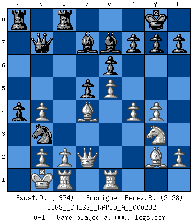 Last move : 0-1 2022 August 7 9:52:33 [Event "FICGS__CHESS__RAPID_A__000282"] [Site "FICGS"] [Date "2022.06.12"] [Round "1"] [White "Faust,Dieter"] [Black "Rodriguez Perez,Rene"] [Result "0-1"] [WhiteElo "1974"] [BlackElo "2128"] 1.e4 e6 2.d4 d5 3.Nc3 Nf6 4.e5 Nfd7 5.f4 c5 6.Nf3 Nc6 7.Be3 a6 8.Qd2 Be7 9.dxc5 Nxc5 10.O-O-O Qa5 11.Kb1 b5 12.g4 b4 13.Ne2 Qc7 14.Ng3 Na4 15.Nd4 Bd7 16.Nxc6 Qxc6 17.Rc1 O-O 18.Bd4 Rfc8 19.Ka1 b3 20.axb3 Nc5 21.Kb1 a5 22.Bg2 Qb7 23.Rhe1 a4 24.b4 Nb3 0-1 French : Steinitz, Boleslavsky variation Queenside Castling by player White (move 10) Kingside Castling by player Black (move 17) Player Black won this chess game. Follow this game move after move (download)Life is like a game of Chess, changing with each move. (Chinese proverb) Ein Springer auf f6 gegen die eigene Rochadestellung ist schlimmer als ein rostiger Nagel im Knie. (Efim Bogoljubov) Si el ingenio solamente fuese necesario para lucirse, las mujeres serían las mejores jugadoras de Ajedrez del mundo. (Albin) Que feriez-vous si vous étiez en train de jouer aux échecs et que la fin du monde arrive ? Je continuerais à jouer. (Saint Borromée) History is the quarrels of popes and kings, with wars or pestilences in every page; the men all so good for nothing, and hardly any women at all. (Jane Austen)