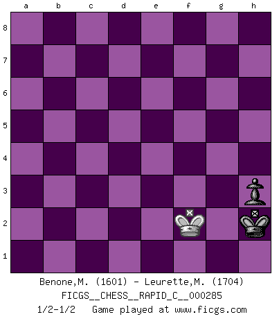 Last move : 1/2-1/2 2022 July 23 20:17:58 [Event "FICGS__CHESS__RAPID_C__000285"] [Site "FICGS"] [Date "2022.06.19"] [Round "1"] [White "Benone,Mateia"] [Black "Leurette,Marc-Antoine"] [Result "1/2-1/2"] [WhiteElo "1601"] [BlackElo "1704"] 1.e4 e5 2.Nf3 Nc6 3.d4 exd4 4.Nxd4 Nf6 5.Nxc6 bxc6 6.e5 Qe7 7.Qe2 Nd5 8.c4 Nb6 9.Nc3 Qe6 10.b3 Bb4 11.Bb2 O-O 12.a3 Bxc3+ 13.Bxc3 d5 14.exd6 cxd6 15.O-O-O Qxe2 16.Bxe2 d5 17.Rhe1 Be6 18.c5 Nd7 19.Bd4 a5 20.Bd3 Rab8 21.Re3 g6 22.Kb2 Rb7 23.Ba6 Ra7 24.Bd3 Nb8 25.f4 a4 26.b4 Bd7 27.f5 Na6 28.b5 cxb5 29.c6 Rc7 30.cxd7 Rxd7 31.Rde1 Rc7 32.Re7 Nc5 33.Bxb5 Nb3 34.Bb6 Rxe7 35.Rxe7 Nd2 36.Re8 Rxe8 37.Bxe8 Nc4+ 38.Kc3 Nxb6 39.fxg6 fxg6 40.Kb4 g5 41.Bxa4 Nxa4 42.Kxa4 Kf7 43.Kb4 Ke6 44.Kc5 Ke5 45.a4 d4 46.a5 d3 47.a6 d2 48.a7 d1Q 49.a8Q Qd4+ 50.Kb5 Qd5+ 51.Qxd5+ Kxd5 52.Kb4 Kd4 53.g3 h5 54.h3 Ke4 55.Kc4 Kf3 56.h4 gxh4 57.gxh4 Kg4 58.Kd3 Kxh4 59.Ke2 Kg3 60.Kf1 Kh2 61.Kf2 h4 62.Kf1 h3 63.Kf2 Kh1 64.Kf1 Kh2 65.Kf2 1/2-1/2 Scotch : Mieses variation Kingside Castling by player Black (move 11) Queenside Castling by player White (move 15) 10 pieces endgame at move 41 : White KBPPP , Black KNPPP WHITE : King + 1 Bishop 3 Pawns BLACK : King + 1 Knight 3 Pawns 9 pieces endgame at move 41 : White KPPP , Black KNPPP WHITE : King + 3 Pawns BLACK : King + 1 Knight 3 Pawns 8 pieces endgame at move 42 : White KPPP , Black KPPP WHITE : King + 3 Pawns BLACK : King + 3 Pawns Promotion Queen by player Black (move 48) Promotion Queen by player White (move 49) 7 pieces endgame at move 51 : White KQPP , Black KPP WHITE : King + 1 Queen 2 Pawns BLACK : King + 2 Pawns 6 pieces endgame at move 51 : White KPP , Black KPP WHITE : King + 2 Pawns BLACK : King + 2 Pawns 5 pieces endgame at move 56 : White KP , Black KPP WHITE : King + 1 Pawn BLACK : King + 2 Pawns 4 pieces endgame at move 57 : White KP , Black KP WHITE : King + 1 Pawn BLACK : King + 1 Pawn 3 pieces endgame at move 58 : White K , Black KP WHITE : King + BLACK : King + 1 Pawn This chess game ended in a draw. Follow this game move after move (download)We must make sure that Chess will not be like a dead language, very interesting, but for a very small group. (Sytze Faber) Im Wettkampf zwischen starken Meistern kommen Fehler sehr selten vor, deshalb ist es mit bloßem Warten nicht getan. (José Raúl Capablanca) Un sacrificio se refuta mucho mejor al aceptarlo. (Wilhelm Steinitz) Demandez au pauvre Cg1 ce qu'il en pense. Eduard Gufeld à propos de la variante Saemisch de l'Est-Indienne. A shortcut is the longest distance between two points. (Don Groves)