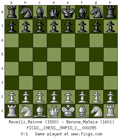 Last move : 0-1 2022 July 19 20:23:30 [Event "FICGS__CHESS__RAPID_C__000285"] [Site "FICGS"] [Date "2022.06.19"] [Round "1"] [White "Revelli,Reinne"] [Black "Benone,Mateia"] [Result "0-1"] [WhiteElo "1500"] [BlackElo "1601"] 0-1 This chess game has been lost on time (started : 2022.06.19 15:57:8) Player Black won this chess game. Follow this game move after move (download)The Pin is mightier than the sword. (Fred Reinfeld) Versuche, dich von der Sklaverei der Eröffnungsvarianten zu befreien. Stattdessen soll man gewisse Typenpositionen erlernen, die man eingehend analysiert. (Aaron Nimzowitsch) El jugador táctico sabe que hacer cuando hay algo que hacer; mientras que el estratega sabe que hacer cuando no hay nada que hacer. (Gerald Abrahams) Les réformistes prétendent que les progrès de la théorie conduiront à la disparition des échecs, et qu'il faut, pour leur rendre vie, en remanier les règles. En réalité, qu'exprime cette affirmation? Le mépris de l'intuition, de l'imagination et de tous les autres éléments qui font des échecs un art. (Alexander Alekhine) Beep ! (R2D2 in Star Wars ep.3)