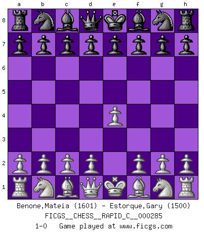Last move : 1-0 2022 July 19 20:23:30 [Event "FICGS__CHESS__RAPID_C__000285"] [Site "FICGS"] [Date "2022.06.19"] [Round "1"] [White "Benone,Mateia"] [Black "Estorque,Gary"] [Result "1-0"] [WhiteElo "1601"] [BlackElo "1500"] 1.e4 1-0 This chess game has been lost on time (started : 2022.06.19 15:57:8) King's pawn Opening Player White won this chess game. Follow this game move after move (download)The King is a fighting piece. Use it ! (Wilhelm Steinitz) Ein Teil des Fehlers ist immer korrekt. (Savielly Grigorievitsch Tartakower) La estratégia requiere pensar, la táctica requiere observación. (Max Euwe) Seul un grand joueur sait à quel point il joue faiblement. (Xavier Tartacover) Man is reluctant to give credit for intelligence to anyone, except his enemies. (Albert Einstein)