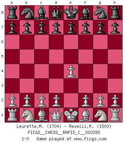 Last move : 1-0 2022 July 19 20:23:30 [Event "FICGS__CHESS__RAPID_C__000285"] [Site "FICGS"] [Date "2022.06.19"] [Round "1"] [White "Leurette,Marc-Antoine"] [Black "Revelli,Reinne"] [Result "1-0"] [WhiteElo "1704"] [BlackElo "1500"] 1.e4 1-0 This chess game has been lost on time (started : 2022.06.19 15:57:8) King's pawn Opening Player White won this chess game. Follow this game move after move (download)There are two types of sacrifices: correct ones and mine. (Mikhail Tal) Wenn sie aufgeben, dann danke ich Ihnen für das Spiel (Eventualzug beim Fernschach). (Anonymous) Aquel que teme a un Peón de Reina aislado, debería de retirarse del Ajedrez. (Siegbert Tarrasch) Vouloir jouer aux échecs contre soi-même est aussi paradoxal que vouloir marcher sur son ombre. (Stefan Zweig) SEO proverb : Make your website optimized for human beings, not for search engines.