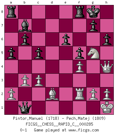 Last move : 0-1 2022 August 23 1:14:24 [Event "FICGS__CHESS__RAPID_C__000285"] [Site "FICGS"] [Date "2022.06.19"] [Round "1"] [White "Pintor,Manuel"] [Black "Pech,Matej"] [Result "0-1"] [WhiteElo "1718"] [BlackElo "1809"] 1.e4 c5 2.f4 d5 3.exd5 Qxd5 4.Nc3 Qd8 5.Nf3 Nc6 6.Bc4 e6 7.d3 Nh6 8.O-O Be7 9.Ne4 O-O 10.Nfg5 Na5 11.Bb5 a6 12.Ba4 Qd4+ 13.Kh1 Qxa4 14.b3 Qd7 15.Qf3 f6 16.Nh3 Nc6 17.Qg3 Nd4 18.c3 Ndf5 19.Qf3 Nh4 20.Qe2 b6 21.Be3 f5 22.Neg5 Bb7 23.Rf2 Ng4 24.Raf1 Nxf2+ 25.Rxf2 a5 26.Qh5 Bxg5 27.Nxg5 h6 28.Qxh4 Qxd3 29.Bd2 Qb1+ 0-1 Sicilian : Grand Prix attack Kingside Castling by player White (move 8) Kingside Castling by player Black (move 9) Player Black won this chess game. Follow this game move after move (download)The chessboard is the world, the pieces are the phenomena of the Universe, the rules of the game are what we call the laws of Nature and the player on the other side is hidden from us. (Thomas Huxley) Modernes Schach sorgt sich zuviel um Dinge wie Bauernstruktur usw. Vergessen Sie das, Schachmatt beendet das Spiel! (Nigel Short) Los errores estan ahí, esperando a que se cometan. (Savielly Tartakower) Vous n'êtes pas toujours obligé de jouer le meilleur coup. Un coup doit être actif, entreprenant, correct et beau ! (David Bronstein) All war is based on deception. (Sun Tzu)