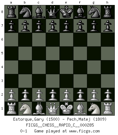 Last move : 0-1 2022 July 19 20:23:30 [Event "FICGS__CHESS__RAPID_C__000285"] [Site "FICGS"] [Date "2022.06.19"] [Round "1"] [White "Estorque,Gary"] [Black "Pech,Matej"] [Result "0-1"] [WhiteElo "1500"] [BlackElo "1809"] 0-1 This chess game has been lost on time (started : 2022.06.19 15:57:8) Player Black won this chess game. Follow this game move after move (download)Chess is mental torture. (Garry Kasparov) Ohne Leiden bildet sich kein Charakter. (Ernst Freiherr von Feuchtersleben) Cualquier cambio de material en una posición debe venir por medio de un mate, una captura o promoción de Peón. (Purdy) Des points faibles ou des trous dans la position de l'adversaire doivent être occupés par des pièces et non pas par des pions. (Siegbert Tarrasch) Chess, like love, like music, has the power to make people happy. (Siegbert Tarrasch)