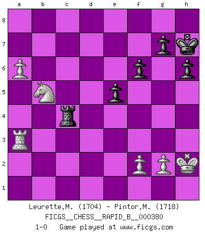 Last move : 1-0 2022 July 6 17:50:31 [Event "FICGS__CHESS__RAPID_B__000380"] [Site "FICGS"] [Date "2022.06.19"] [Round "1"] [White "Leurette,Marc-Antoine"] [Black "Pintor,Manuel"] [Result "1-0"] [WhiteElo "1704"] [BlackElo "1718"] 1.e4 e5 2.Nf3 Nc6 3.Bc4 Bc5 4.c3 Qf6 5.b4 Bb6 6.a4 a6 7.a5 Ba7 8.d3 h6 9.O-O d6 10.Re1 Qg6 11.Nbd2 Bg4 12.Nf1 Nf6 13.Be3 O-O 14.Bxa7 Nxa7 15.Ng3 Nh5 16.Nh4 Qg5 17.Nf3 Qg6 18.Nxh5 Qxh5 19.Re3 Nb5 20.Bxb5 axb5 21.h3 Be6 22.d4 Qg6 23.dxe5 Bxh3 24.Nh4 Bg4 25.Nxg6 Bxd1 26.Ne7+ Kh7 27.Rxd1 dxe5 28.Rd7 b6 29.Nc6 Rac8 30.Rd5 f6 31.Rg3 Rf7 32.Na7 c6 33.Nxc8 cxd5 34.exd5 bxa5 35.bxa5 Rc7 36.Nd6 Rd7 37.Nxb5 Rxd5 38.c4 Rd1+ 39.Kh2 Rc1 40.a6 Rxc4 41.Ra3 1-0 Giuoco Piano Kingside Castling by player White (move 9) Kingside Castling by player Black (move 13) Player White won this chess game. Follow this game move after move (download)Chess is not like life... it has rules ! (Mark Pasternak) Ohne ihre Erfolge schmälern zu wollen würde ich sagen Petrosian, Spassky und Karpov verdanken ihre Siege ihren Trainern - Boleslavsky, Bondarevsky und Furman. (Mikhail Moiseyevich Botvinik) ¿Cual es el objetivo de jugar una apertura de gambito?... Para adquirir una reputación de ser un jugador apuesto a costo de perder el juego. (Siegbert Tarrasch) L'ordinateur a tué l'originalité. Il n'y a plus guère d'aventures sur l'échiquier. (Jacob Murray) The quality of decision is like the well-timed swoop of a falcon which enables it to strike and destroy its victim. (Sun Tzu)