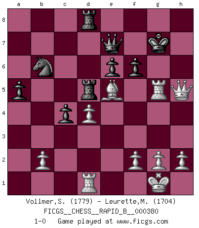 Last move : 1-0 2022 July 3 15:11:40 [Event "FICGS__CHESS__RAPID_B__000380"] [Site "FICGS"] [Date "2022.06.19"] [Round "1"] [White "Vollmer,Steve"] [Black "Leurette,Marc-Antoine"] [Result "1-0"] [WhiteElo "1779"] [BlackElo "1704"] 1.d4 d5 2.c4 e6 3.Nc3 Nf6 4.Nf3 Be7 5.Bg5 h6 6.Bh4 b6 7.e3 Bb7 8.Bd3 Nbd7 9.O-O O-O 10.Rc1 dxc4 11.Bxc4 c5 12.Qe2 Nd5 13.Bg3 a6 14.a4 Bc6 15.Rfd1 Nxc3 16.Rxc3 Bxa4 17.Ra1 b5 18.Ne5 bxc4 19.Rxa4 cxd4 20.exd4 Nb6 21.Nc6 Qe8 22.Nxe7+ Qxe7 23.Ra1 Rfd8 24.Rd1 a5 25.Qg4 Rd5 26.Bf4 h5 27.Qe2 g6 28.Rg3 Rc8 29.Rc3 Kg7 30.Rg3 Rcd8 31.Be5+ f6 32.Qxh5 g5 33.Rxg5+ 1-0 QGD : 4.Nf3 Kingside Castling by player White (move 9) Kingside Castling by player Black (move 9) Player White won this chess game. Follow this game move after move (download)Even the laziest King flees wildly in the face of a double check ! (Aaron Nimzowitsch) Fischer machte Schach einfach zu einer aufregenden Sache, wann immer er sich ans Brett setzte. (Raymond Keene) Vive, pierde y aprende al observar a tu oponente como gana. (Amber Steenbock) Ce n'est pas pour s'amuser qu'il joue aux échecs : il célèbre un culte. (Vladimir Nabokov) If you are good, you will be assigned all the work. If you are really good, you will get out of it. (Dan Rotaru)