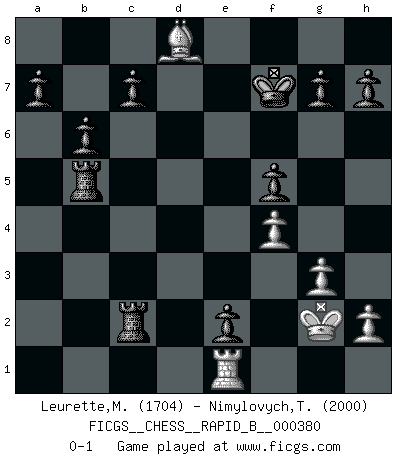 Last move : 0-1 2022 July 8 17:1:17 [Event "FICGS__CHESS__RAPID_B__000380"] [Site "FICGS"] [Date "2022.06.19"] [Round "1"] [White "Leurette,Marc-Antoine"] [Black "Nimylovych,Taras"] [Result "0-1"] [WhiteElo "1704"] [BlackElo "2000"] 1.e4 e5 2.Nf3 Nc6 3.Bc4 Bc5 4.c3 Nf6 5.b4 Be7 6.d3 d5 7.exd5 Nxd5 8.Bxd5 Qxd5 9.O-O Bf5 10.Ne1 O-O 11.a4 Rad8 12.Be3 Bxd3 13.Nxd3 Qxd3 14.Qxd3 Rxd3 15.b5 Na5 16.Ra2 Nc4 17.Bc1 Rfd8 18.Na3 Rxc3 19.Nxc4 Rxc4 20.Be3 b6 21.g3 f5 22.f4 Rd3 23.Bd2 Bc5+ 24.Kg2 e4 25.Re1 e3 26.Bc1 Rdc3 27.Ra1 Rc2+ 28.Kh3 e2 29.Kg2 Bb4 30.Ba3 Bxe1 31.Rxe1 Rxa4 32.Be7 Kf7 33.Bh4 Ra5 34.Bd8 Rxb5 0-1 Giuoco Piano : Bird's attack Kingside Castling by player White (move 9) Kingside Castling by player Black (move 10) Player Black won this chess game. Follow this game move after move (download)Help your pieces so they can help you. (Paul Morphy) Fischer ist das größte Genie, das je vom Schachhimmel heruntergestiegen ist. (Mikhail Nekhemyevich Tal) El pensamiento metódico es mas útil en el Ajedrez que la inspiración. (C. J. S. Purdy) Demandez au pauvre Cg1 ce qu'il en pense. Eduard Gufeld à propos de la variante Saemisch de l'Est-Indienne. As the days dwindle down... to a precious few. (Maxwell Anderson)