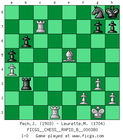 Last move : 1-0 2022 August 21 16:16:11 [Event "FICGS__CHESS__RAPID_B__000380"] [Site "FICGS"] [Date "2022.06.19"] [Round "1"] [White "Pech,Jaroslav"] [Black "Leurette,Marc-Antoine"] [Result "1-0"] [WhiteElo "1903"] [BlackElo "1704"] 1.c4 e5 2.Nc3 Nf6 3.Nf3 Nc6 4.g3 d6 5.Bg2 Be6 6.d4 Nxd4 7.Nxd4 exd4 8.Qxd4 c6 9.O-O d5 10.cxd5 cxd5 11.Rd1 Be7 12.Qa4+ Qd7 13.Qxd7+ Nxd7 14.Nxd5 O-O 15.Nxe7+ Kh8 16.b3 Rab8 17.Bf4 Rbe8 18.Bd6 b6 19.Rac1 a5 20.Bc6 Nf6 21.Nd5 Bxd5 22.Bxd5 Rg8 23.Bxf7 Rxe2 24.Bxg8 Nxg8 25.a4 Rb2 26.Rc7 Rxb3 27.Be5 1-0 English Opening Kingside Castling by player White (move 9) Kingside Castling by player Black (move 14) Player White won this chess game. Follow this game move after move (download)Some part of a mistake is always correct. (Savielly Tartakover) Die Auseinandersetzung mit Karpow war politisch geprägt. Er stand für das kommunistische System, wurde von dessen Repräsentanten gehätschelt. Ich war der Oppositionelle. Jeder Schachweltmeister spiegelt auch die gesellschaftlichen Verhältnisse wider. Kramnik steht für die Börsen-Generation des Neuen Markts, ideologiefrei, zahlenfixiert. (Garry Kasparov) Peones: ellos son el alma de esta partida, solos forman el ataque y la defensa. (Philidor) RxDa4 pat (...) He who fights with monsters should be careful lest he thereby become a monster. (Friedrich Nietzsche, Beyond Good and Evil)